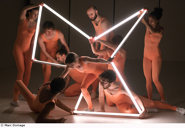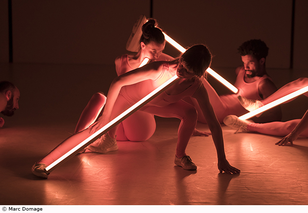 Là où des pièces comme evaporated landscapes faisaient du corps un simple agent des transformations de la matière, Moving in Concert cherche un point d’interconnexion plus profond entre les danseurs et la matière avec laquelle ils cohabitent. Au sein de cet écosystème autonome viennent se refléter les échanges et les interactions invisibles qui régissent notre relation aux objets – comme une projection des rapports ambigus que le sujet contemporain entretient avec un environnement de plus en plus connecté. Déplacée sur un plan simultanément abstrait et concret, la danse produit des zooms, des fissions, des condensations, des accélérations, des boucles. À la fois extase matérialiste et réflexion critique sur notre rapport fétichiste aux choses, Moving in Concert est un spectacle en mouvement fait de sons, de gestes, de couleurs – où tous les éléments se meuvent de concert.