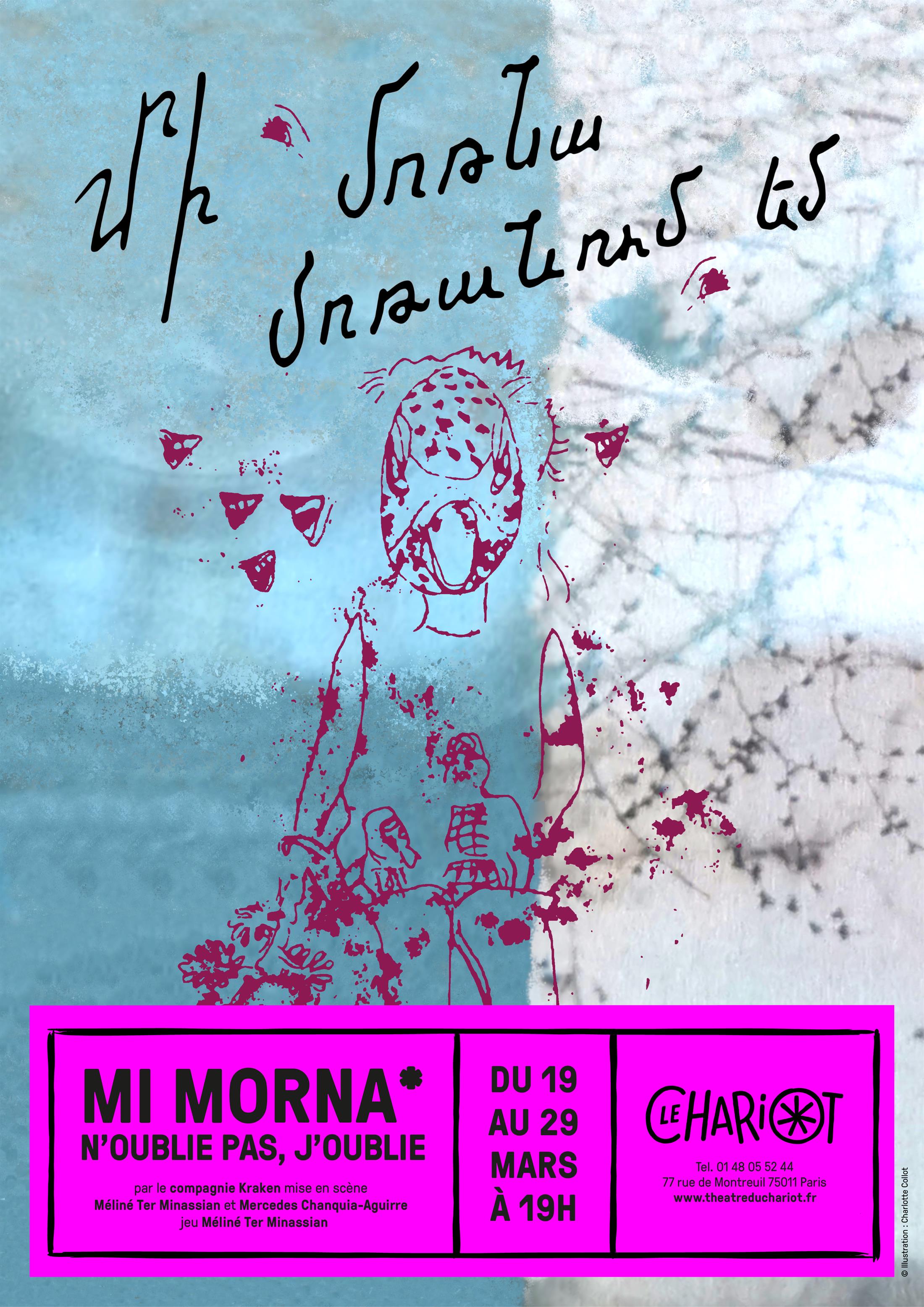 « Mi morna, moranum em », c’est « n’oublie pas, j’oublie » en arménien occidental et en arménien oriental, car ici, les langues s’emmêlent les unes aux autres. Sur scène, des objets restés en mémoire, des vielles chansons qui ressurgissent. En découvrant une lignée de femmes de ladizspora arménienne, nous traversons les époques, à la fois proches et loin de la guerre, entre obscurité et lumière.