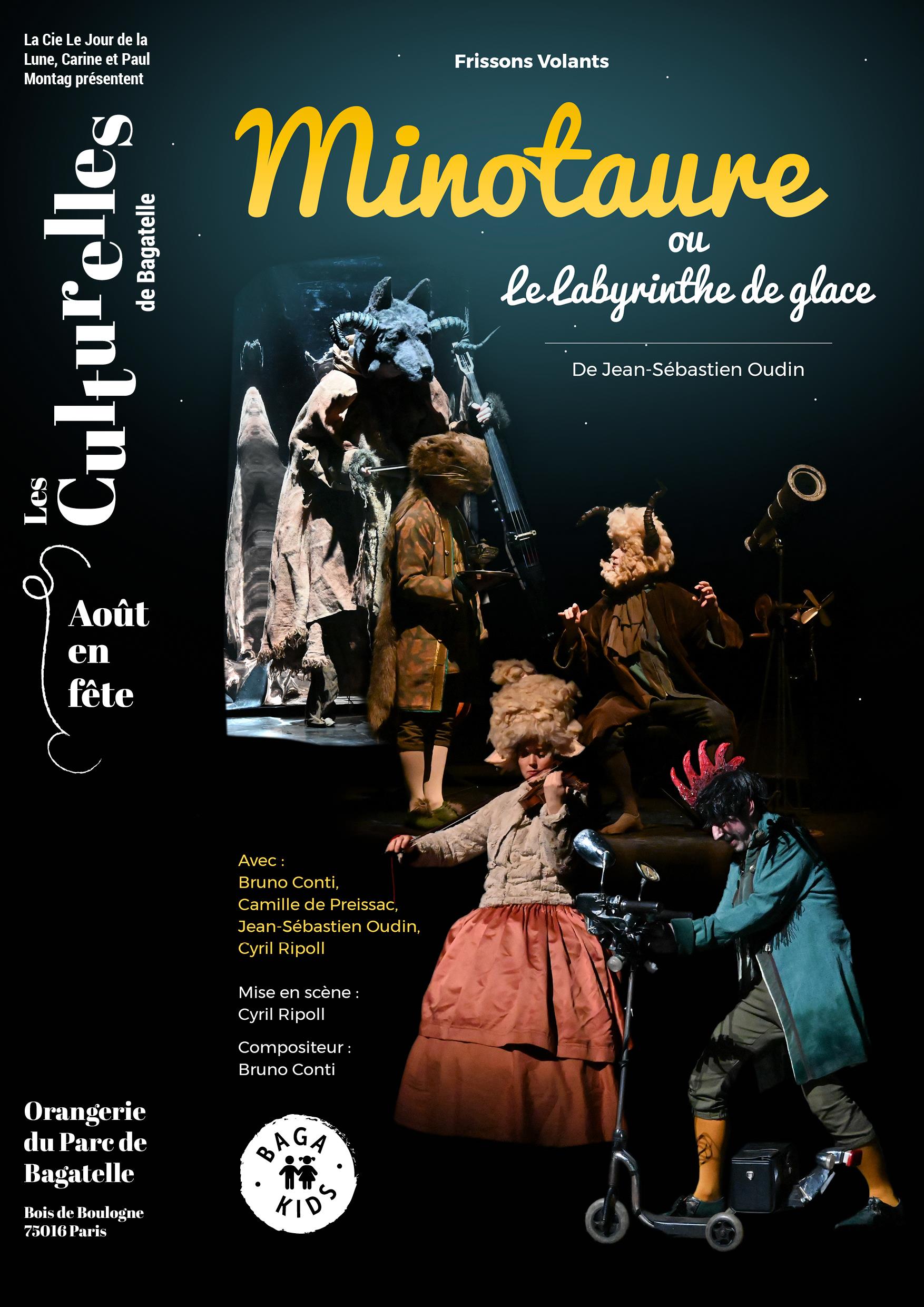 Dans un royaume de moutons qui se complaisent dans les rumeurs, le Minotaure est victime de sa différence. Pour sauver son fils injustement accusé du meurtre du poussin Icare, le vieux bélier Minos se résout à le faire enfermer dans le terrifiant labyrinthe de glace. Mais le coq Thésée arrive… Un violon, un violoncelle, un clavier, d’autres objets sonores… Quatre comédiens musiciens invitent petits et grands voyageurs de l’imaginaire à pénétrer dans le mystérieux labyrinthe de glace du Minogaure, notre bélier à tête de loup. Dans cette aventure fabuleuse où les phrases musicales répondent à la musique des mots, Minotaure ou Le Labyrinthe de glace bouleverse malicieusement les a priori sur la vision d’un monstre.