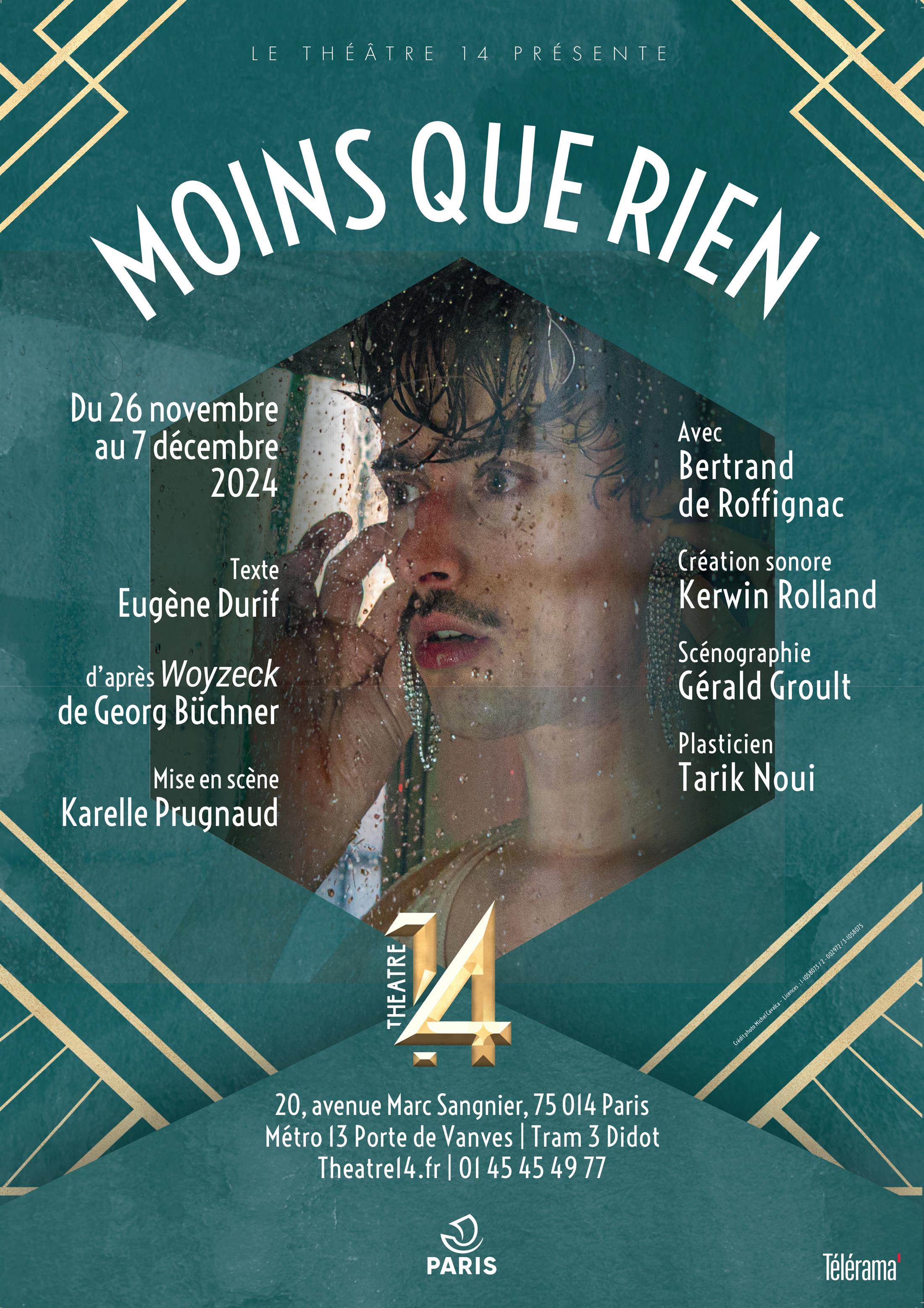 « Au Théâtre 14, la metteuse en scène Karelle Prugnaud et le comédien Bertrand de Roffignac proposent dans Moins que rien un captivant Woyzeck. À la fois physique et plastique, l’adaptation de la pièce est saisissante de violence et d’inconfort. » Sceneweb