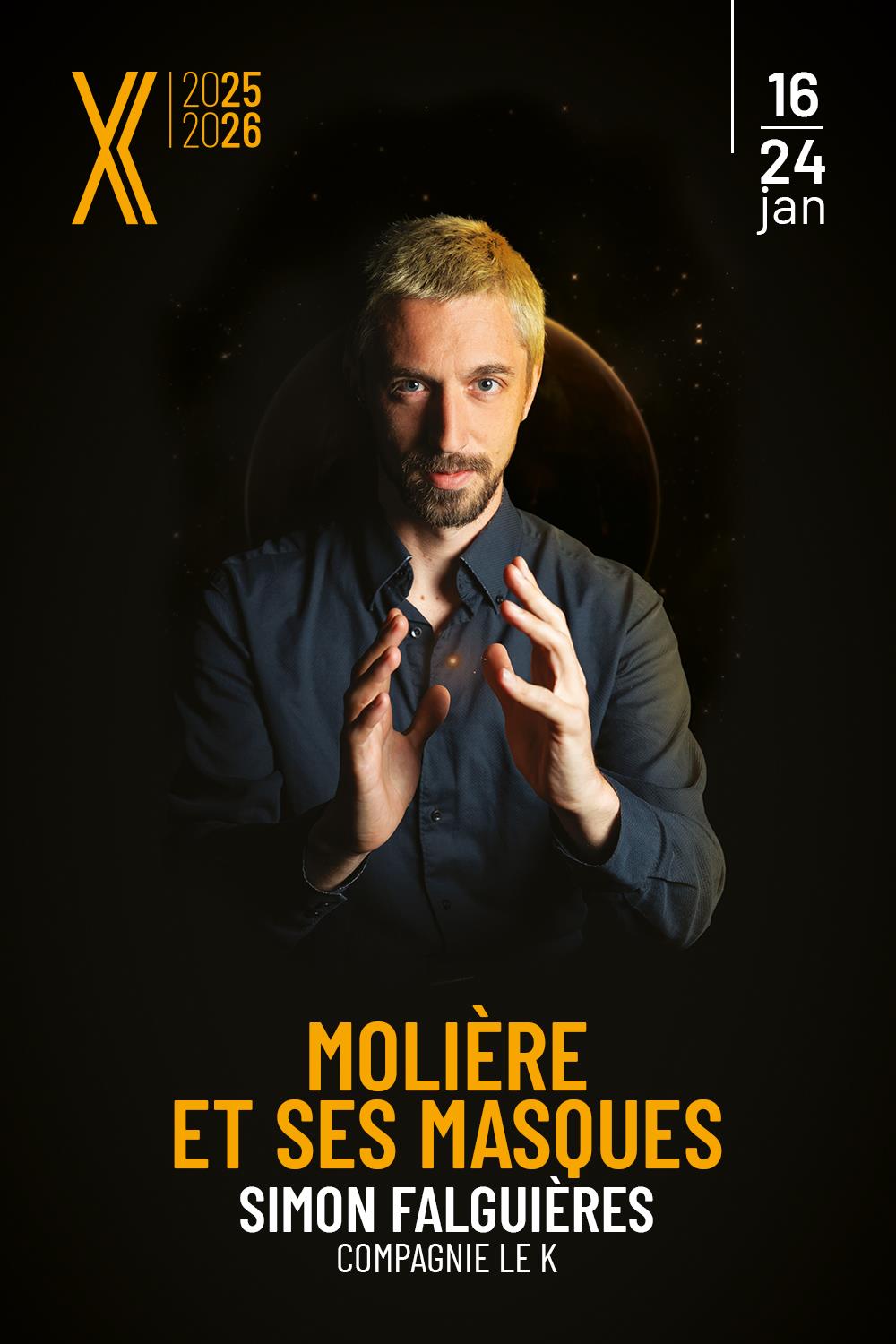 Molière et ses masques est une écriture contemporaine sur la vie et la mort du plus célèbre auteur dramatique français, Jean-Baptiste Poquelin dit Molière. Une pure comédie sur notre temps en passant par la figure tutélaire du théâtre français : Molière.