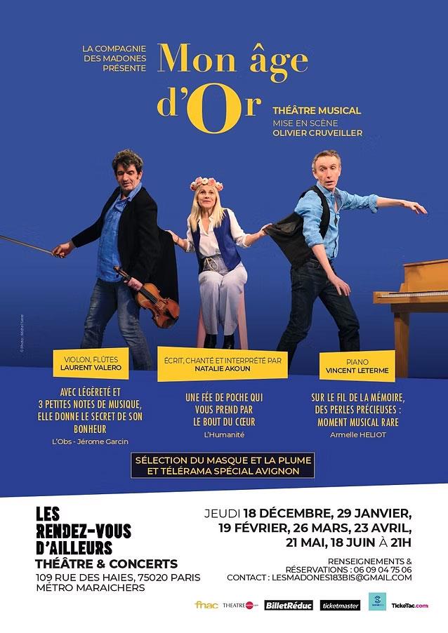 Mon Âge d’Or, raconte la naissance d’une vocation d’artiste d’une jeune Parisienne. Son enfance, ses années d’étude, ses premières amours, son parcours d’actrice. De Mnouchkine à Léo Ferré, des colos au Conservatoire, Natalie Akoun, frêle silhouette de fée entourée de ses deux comparses musiciens Vincent Leterme et Laurent Valero, espiègles à souhait, met sa vie en chansons. Une merveille de charme et d’intelligence.