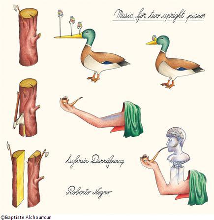 2 hommes, Sylvain Darrifourcq et Roberto Negro, 2 pianos préparés, 2 toms de batterie, 2 tempi évoluant dans une symétrie faussement parfaite.