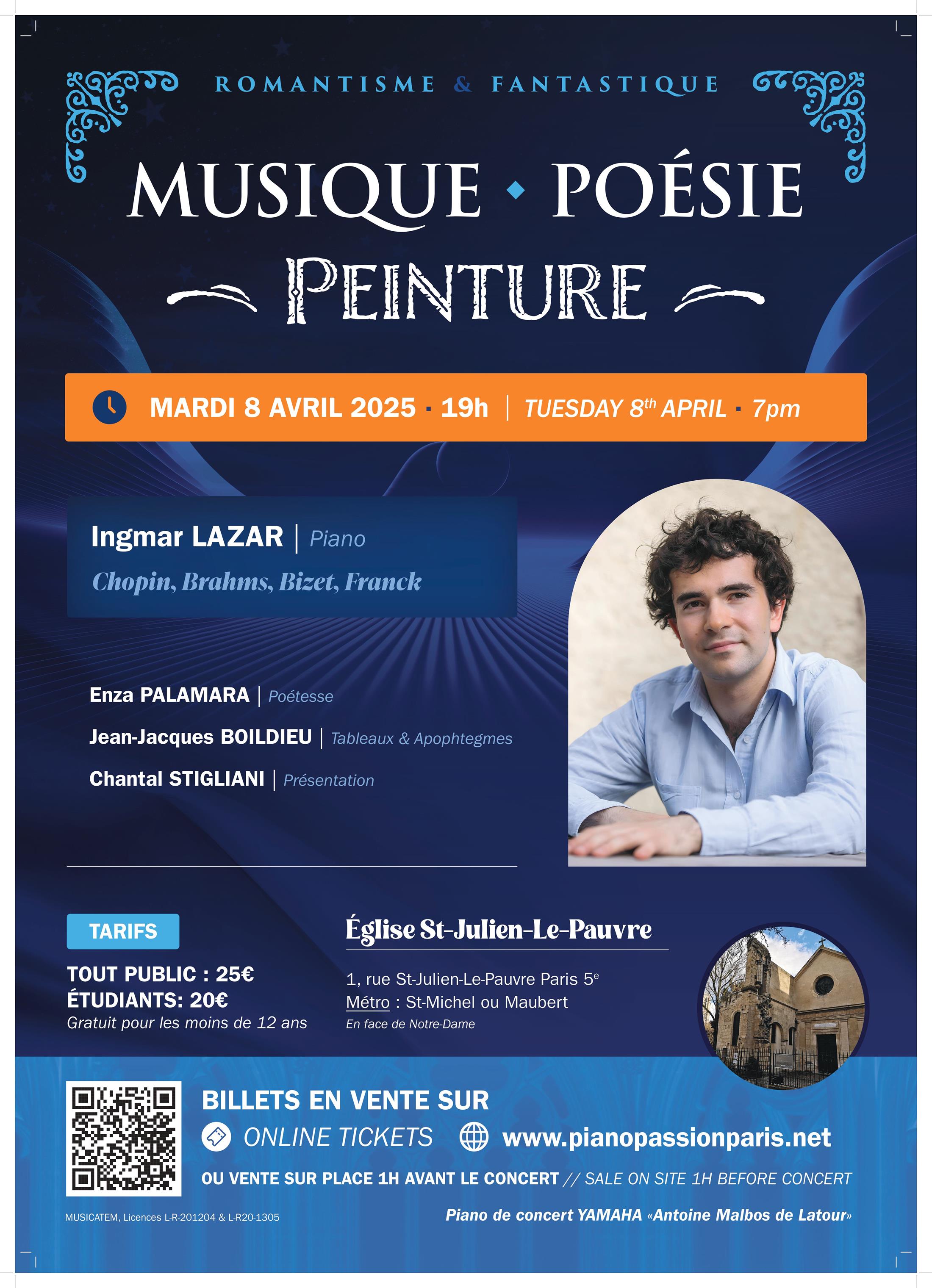 Un programme où les arts se rencontrent avec le pianiste Igmar Lazar, la poétesse Enza Palamara et le peintre Jean-Jacques Boildieu.