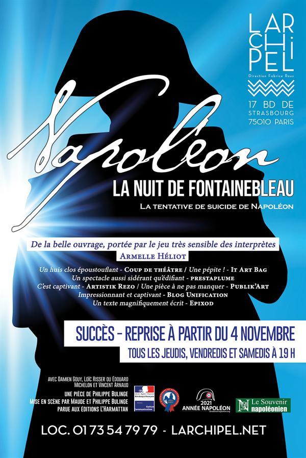 Dans la nuit du 12 au 13 avril 1814, Napoléon a tenté de mettre fin à ses jours. L'empereur déchu échange avec le Général De Caulaincourt et son médecin le Docteur Yvan. La légende de Napoléon se met en place. Les dialogues sont justes et intenses. Très belles prestations de Damien Gouy, Loïc Risser, Arnaud Vincent La configuration de la salle permet de s’immerger totalement dans la pièce.