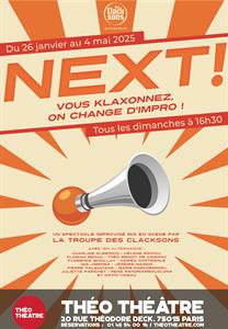 Un concept unique : Le public est muni de klaxons, à tout moment, chacun.e peut influer sur une improvisation d’un coup de klaxon. Des histoires touchantes aux situations loufoques, Next ! explore une variété infinie d’univers. Vous n’êtes alors plus simplement spectateur.ices : vous participez activement à la création d’un spectacle unique à chaque représentation.