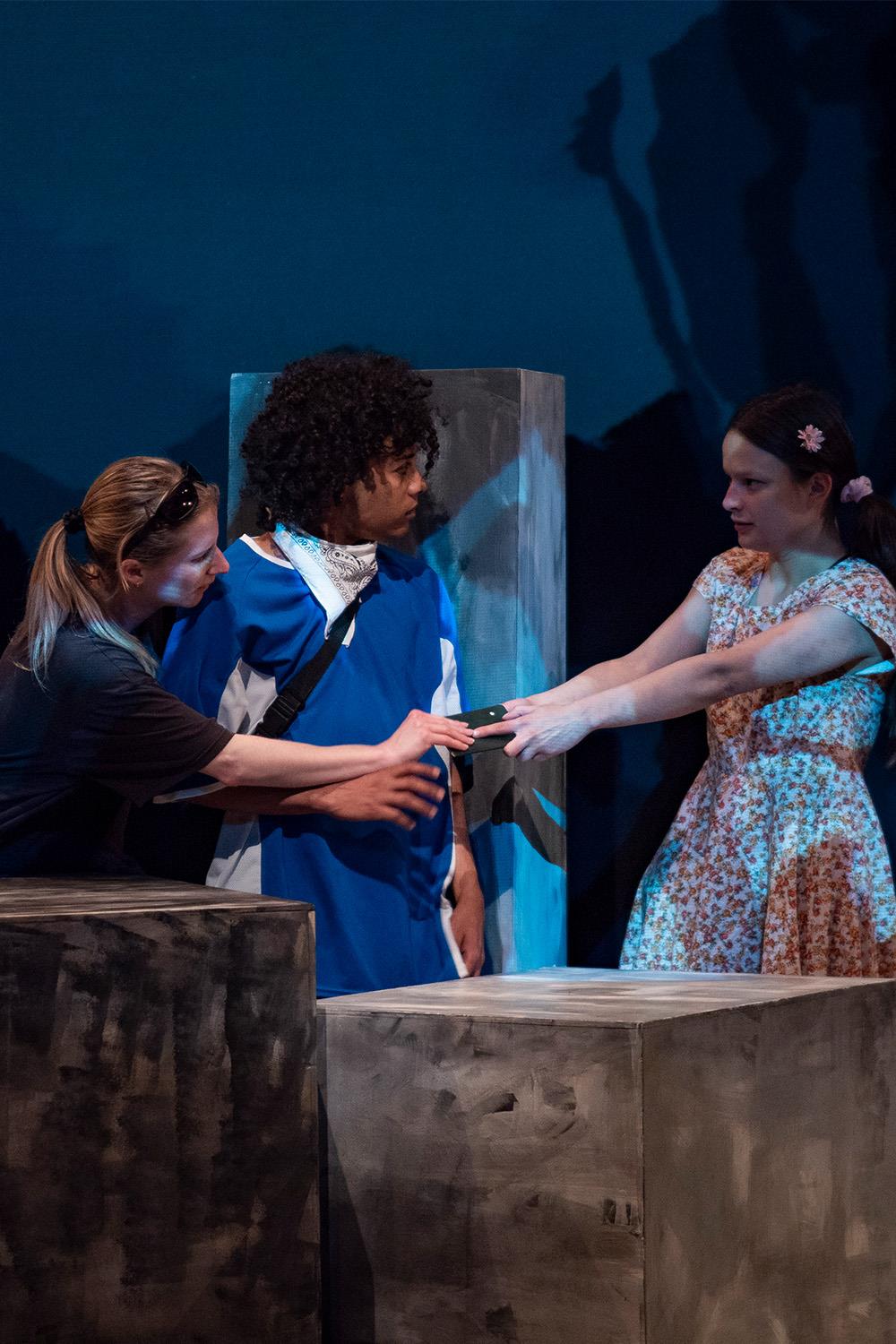 Alternant la narration et les dialogues, la langue est inventive et profonde. L’énergie, le jeu et la sensibilité de la jeunesse sont portés avec réalisme par les interprètes qui nous emmènent dans un décor de bord de mer : rochers symbolisés par des cubes, et horizon d’images impressionnistes projetées sur grand écran.