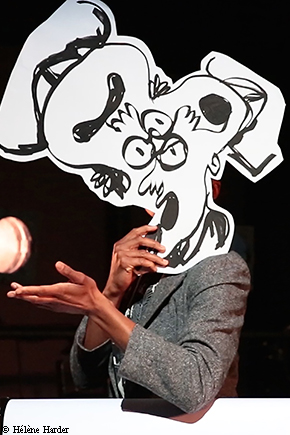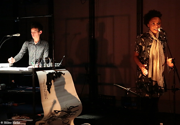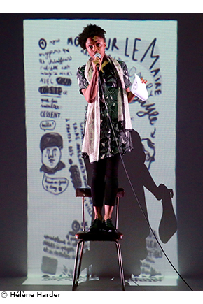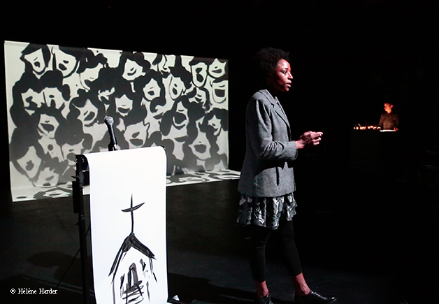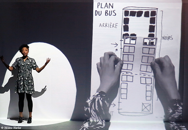 Sur scène, une comédienne et une dessinatrice. Elles nous proposent une expérience empathique : devenir noire pendant la ségrégation, entrer dans la peau de Claudette Colvin. La première s’adresse au public et incarne les multiples protagonistes de l’affaire. Installée à une table, la seconde compose des images projetées en direct. Ensemble, elles enquêtent et reconstituent les faits, exhumant des archives la vie de la jeune fille, aujourd’hui oubliée, en un roman graphique théâtral.