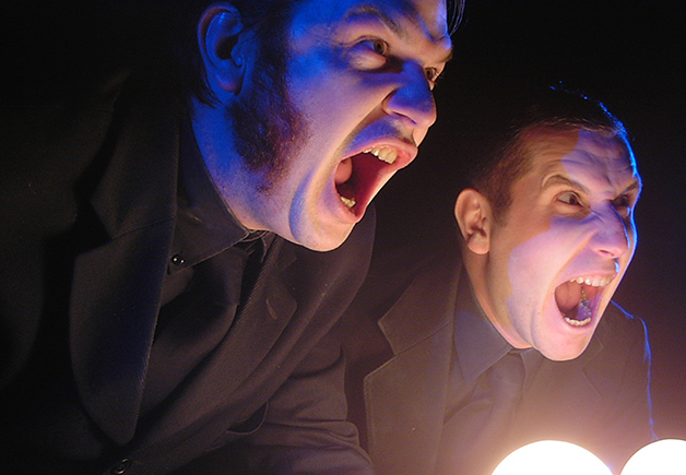 Entre bruits de tonnerre et pannes de courant, musique dramatique et effets de suspense, on baigne dans une atmosphère de film de série Z. Les héros, réduits à l'état de têtes d'ampoule, tremblent de tous leurs membres. En croque-morts impassibles, Denis Athimon et Julien Mellano ont imaginé un spectacle truffé de références cinématographiques où l’humour décapant électrise le théâtre d’objets.