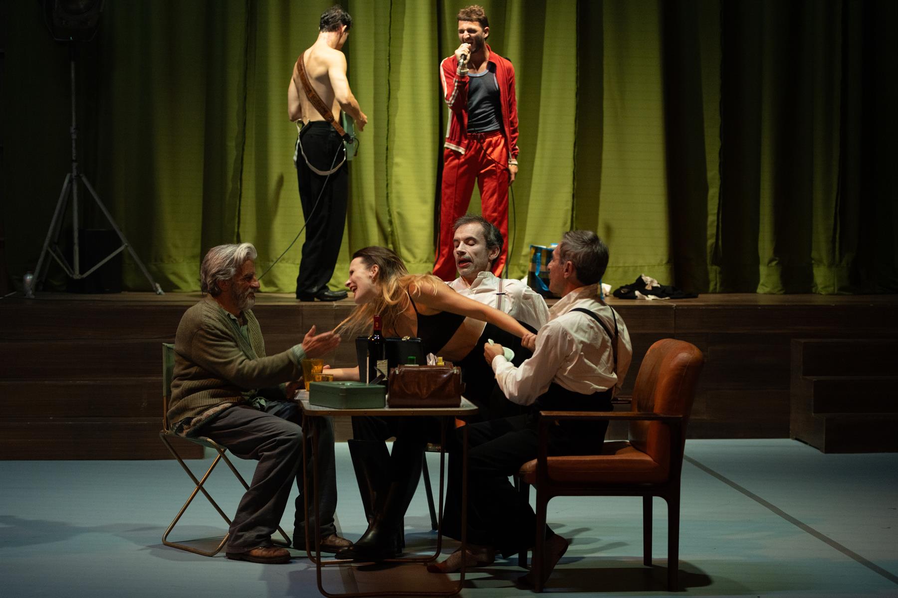 Eux ne font pas partie de la famille mais ils ont été engagés pour grossir les rangs de la troupe et tenter de faire remonter les recettes. Entre eux tous, la cohabitation est loin d’être simple. Ce soir-là, dans cette arrière salle de salle des fêtes, la troupe doit célébrer les fiançailles entre Joséphine, la fille ainée du clan, et Raban, le jeune premier. Mais cette petite cérémonie vire rapidement au règlement de compte.