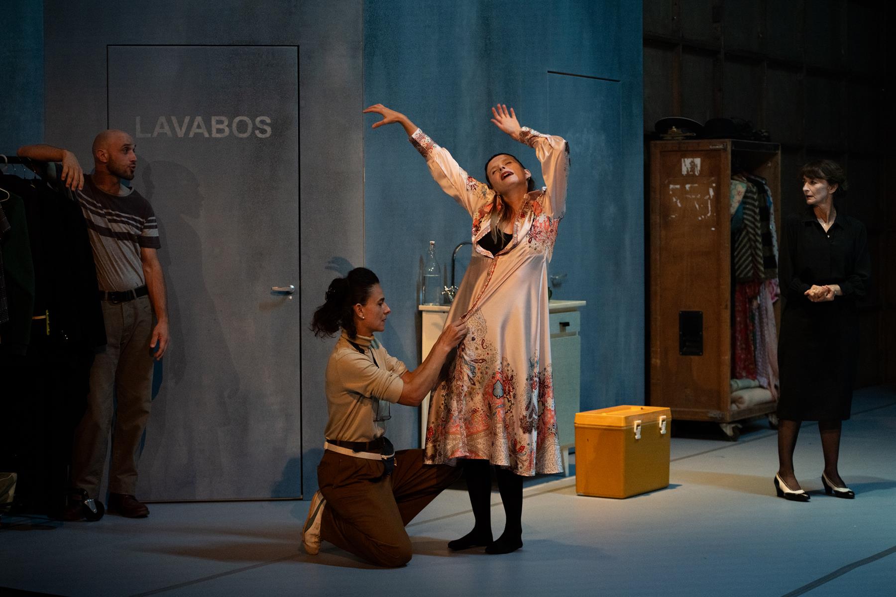 Le second de ces enjeux était le choix de la période à laquelle j’ai décidé de situer l’action. Deux possibilités s’offraient à moi : choisir, comme semble l’indiquer Lagarce, de raconter cette histoire dans l’Europe centrale du début du XXe siècle, à la veille de la Première Guerre mondiale, ou au contraire, transposer la pièce à l’époque à laquelle elle a été écrite, c’est-à-dire à la fin des 1980 - début des années 1990. C’est cette dernière possibilité que j’ai retenue. Je ne suis pas un adepte de la transposition à toute force mais il me semble que dans le cas présent, la charge autobiographique de Nous, les héros justifie pleinement ce choix. Pour être plus précis et afin d’éviter toute torsion trop volontaire du texte, j’ai choisi de placer le récit juste avant la chute du mur de Berlin. La guerre froide et le face à face des deux blocs permettent, en effet, de raconter très concrètement ce voyage « à l’Est » auquel Lagarce nous invite. Par ailleurs, la musique étant particulièrement présente dans cette pièce, la transposition dans les années 1980 rend plus jubilatoire encore l’antagonisme entre différents styles musicaux (musique classique et variété notamment) mais également leur rapprochement (je pense par exemple à Queen ou à Klaus Nomi chantant l’Air du froid de Purcell). Lagarce indique, en effet, de manière précise, des intermèdes musicaux, parfois chantés par certains personnages. Mais il laisse le soin au metteur en scène d’en imaginer la teneur. La radio sera ainsi très présente dans ces loges de fortune, diffusant tubes et émissions nocturnes. Cependant, une partie de la musique du spectacle sera composée et interprétée en scène par Thomas Gendronneau, comme ces soirs de tournée où l’on se saisit d’une guitare pour accompagner les camarades en train de chanter. Au-delà de cette inspiration musicale, les années 1980 offrent, enfin, une très grande liberté esthétique tant à Camille Duchemin pour la scénographie qu’à Caroline de Vivaise pour les costumes.