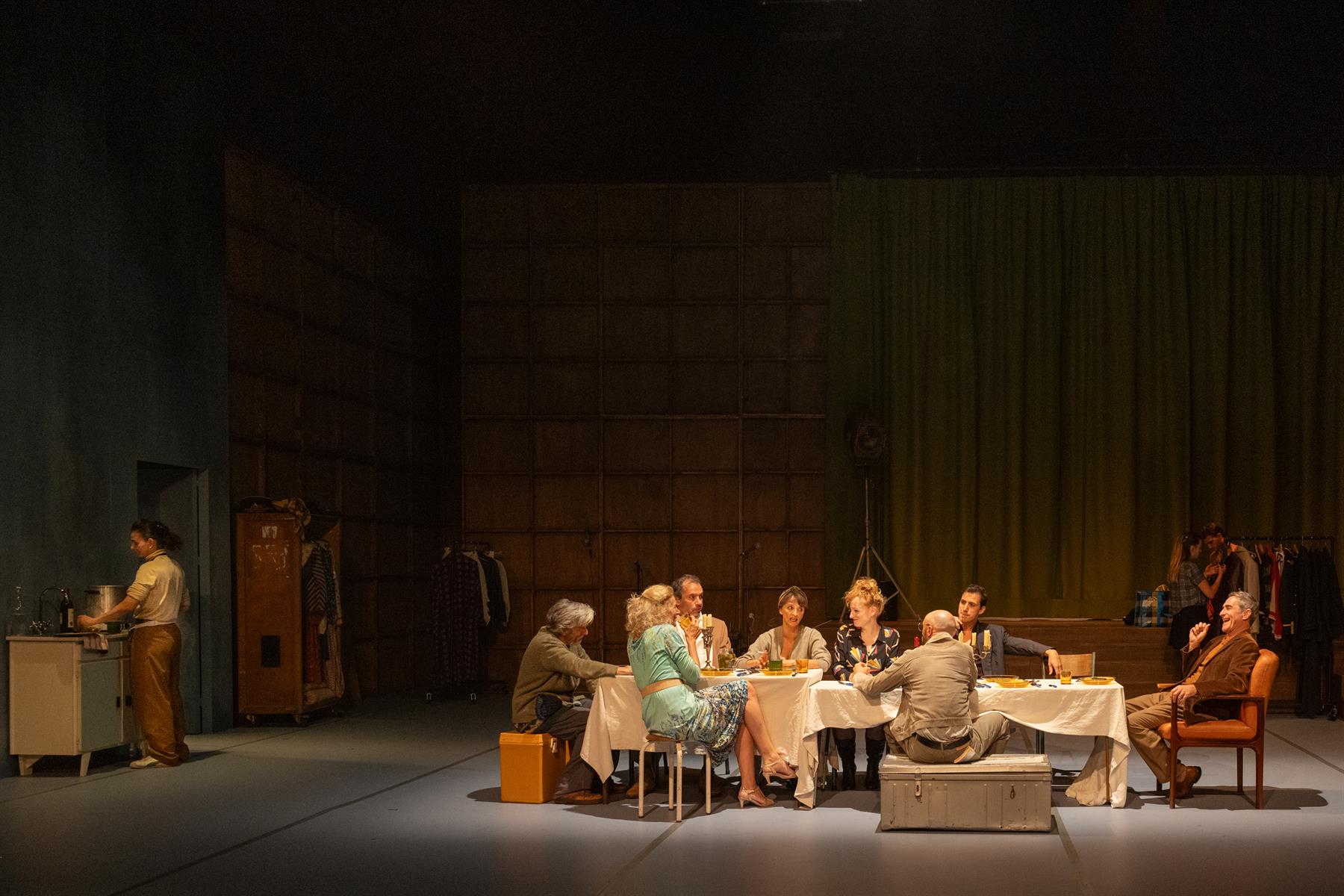 Sur scène, un repas de noces. Chez Brecht, c’étaient les meubles qui se déglinguaient un à un, chez Lagarce, ce sont les rêves des protagonistes, les membres d’une troupe de théâtre en tournée. Sortis de scène, ces comédien.nes sont face à eux-mêmes, leurs hésitations et leurs certitudes, exacerbées par la rudesse et les difficultés de leur métier. Même lorsqu’ils ne sont pas ou plus bons, Jean-Luc Lagarce les aime, lui qui avait écrit cinq ans plus tôt le magnifique « Music-Hall ». Elsa Lepoivre, Vincent Dissez, Olivier Debbasch, Guillaume Ravoire, Thomas Gendronneau, etc, une distribution magistrale dont Clément Hervieu-Léger a tiré le meilleur sur scène, y compris quand il s’est agi de chanter. Il est par contre resté au milieu du gué dans la transposition de la pièce : Lagarce l’a située en Allemagne à la veille de la Première Guerre Mondiale, Hervieu-Léger l’a transposée en France dans les années 1980 mais sans oser couper les références spatio-temporelles du texte. Je peux comprendre qu’il n’ait pas osé couper dans la langue de Lagarce ; mais alors pourquoi nous perdre avec ce changement de contexte plutôt que de chercher à en tirer parti ? Ce seul bémol posé, nous recevons pleinement ce bel hommage à la vie de troupe. N’oublions d’ailleurs pas qu’il n’était pas seulement auteur mais aussi directeur de troupe. Dans cette pièce, on retrouve cette expérience dans les thèmes abordés mais aussi une partie de sa vie dans certains des personnages.