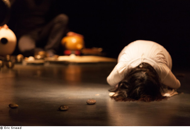Et l’on assiste à la genèse du monde, réinventée sur le plateau, par l’art croisé d’une danseuse, d’une chanteuse et d’un percussionniste. Ils nous content le mythe de Shou, Tefnout, Geb et Nout, dieux et déesses de la mythologie égyptienne, qui symbolisent les quatre éléments : l’air, l’eau, la terre et le ciel. La voix, le mouvement et le rythme donnent corps à la lumière, animent la matière, et plongent le spectateur aux confins du mystère de l’existence.
