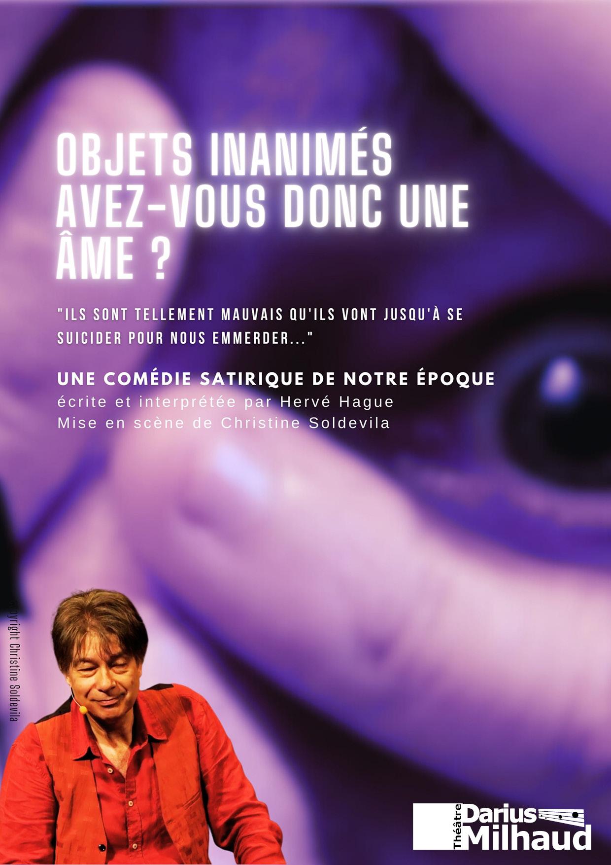 Ce seul en scène unique en son genre caricature notre dépendance aux objets. Non seulement ils nous martyrisent quotidiennement et règnent sur nos vies, mais en plus ils se préparent à prendre le pouvoir absolu ! Pour éviter l’esclavage qui nous guette, Hervé Hague a une profession de foi : faire marcher sa tête et son cœur. À partir de 12 ans.