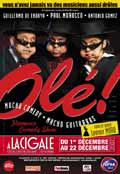 Olé, ce sont trois guitares, trois habits noirs, trois chapeaux qui jouent ensemble dans un spectacle des plus imprévisible, drôle et spectaculaire. C’est un mélange effervescent de musique et comédie, rempli d’inventions surréalistes avec beaucoup d’entrain. Olé joue de toute sorte de musique vivifiante : du flamenco à la salsa en passant par le swing, le blues, le jazz et le pop.