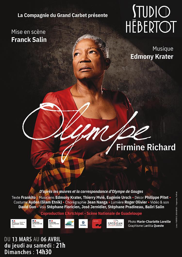 Olympe est une pièce de théâtre qui fait revivre la célèbre écrivaine, incarnée par Firmine Richard, découvrir son parcours exceptionnel et la modernité de sa pensée. Ce monologue écrit par Franck Salin (Frankito), à partir des œuvres et de la correspondance de cette pionnière du féminisme et de la lutte pour l'abolition de l'esclavage des Noirs, dresse d'elle un portrait sensible et intimiste. Cette création est l'occasion d'une rencontre inédite, sur la scène d'un théâtre, entre l'Occitanie et la Guadeloupe. Convoquant la musique, composée par Edmony Krater, la danse et la vidéo, ce spectacle pluridisciplinaire répond également à une urgence de notre temps : celle de combattre pied à pied la misogynie, le racisme et les discriminations qui, sans vergogne, s'y épanouissent.