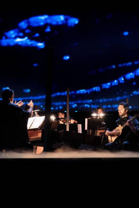 La musique de ce spectacle puise dans le répertoire de Monteverdi des extraits d’opéras, des madrigaux (Livres VII et VIII) et de la musique sacrée. Le lien se noue entre musique et vidéo avec subtilité et poésie. Le lyrisme de Monteverdi se mêle aux ambiances sonores de la vidéo. La création lumière, quant à elle, synchronise ces mouvements visuels et auditifs pour mieux nous immerger dans un espace-temps magnétique et des univers opposés qui s’assemblent avec ingéniosité et délicatesse.