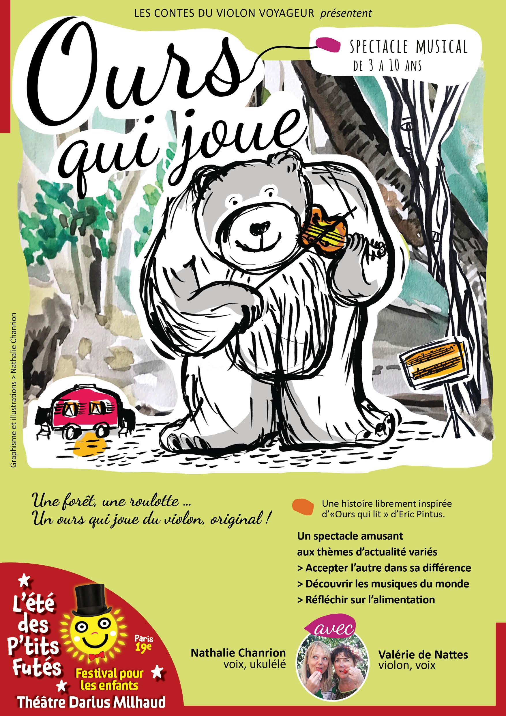 Un spectacle amusant et participatif aux thèmes d’actualité variés : Accepter l’autre dans sa différence, découvrir instruments de musique ethniques, ritournelles et musiques du monde, le violon et le ukulélé, apprendre quelques recettes et réfléchir sur l’alimentation… Une histoire très librement inspirée de Ours qui lit de Eric Pintus.