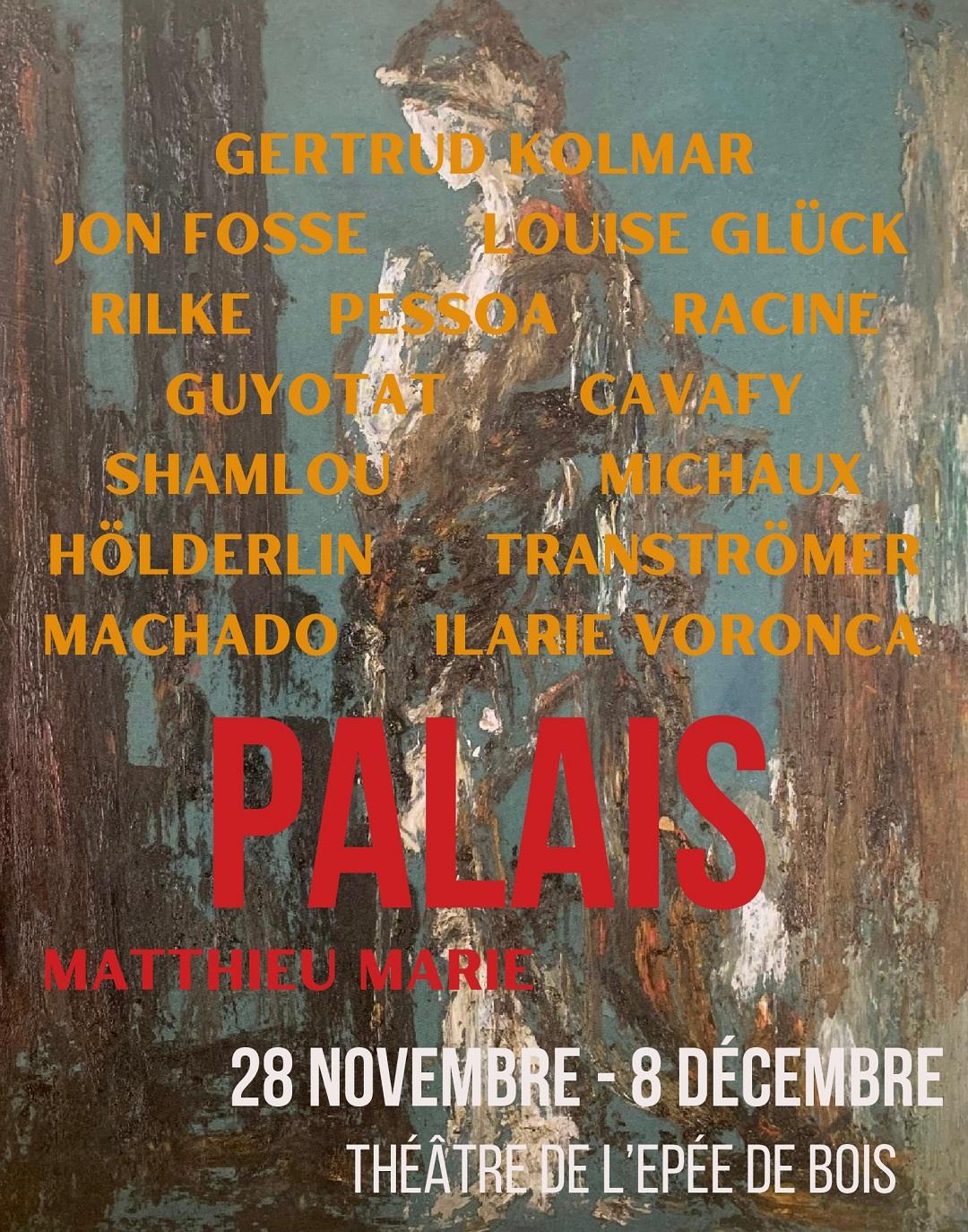 Un choeur : musiciennes et musiciens, actrices et acteurs, nous écrivons comme autant d'étoiles survenues sur le théâtre au hasard des rencontres, une fragile et douce cosmologie. Poèmes, chansons, paroles perdues... Palais d'un jour.