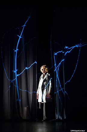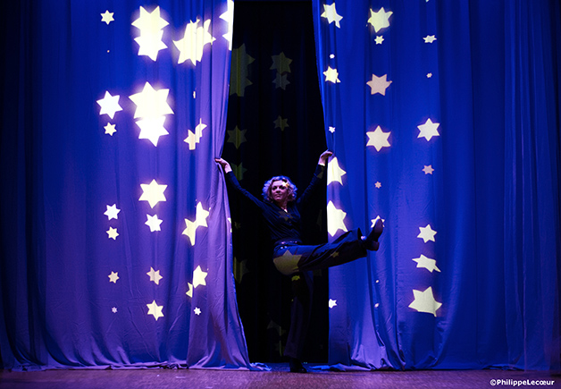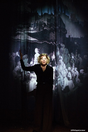 En fond de scène, c’est un tout autre univers : le monde de l’enfance. Des voiles transparents se superposent et sculptent la lumière. Ils forment une voûte magique sur laquelle nous projetons les vidéos d’un ciel étoilé. Ces étoiles, symboles de tant d’ âmes parties trop tôt, nous font voyager dans l’espace et le temps, offrant une respiration au milieu de ces textes poignants. Entre ces voiles, la comédienne devient alors l’enfant dont le nom s’inscrit au milieu des astres. Les souvenirs prennent vie en images, en musique et réveillent le Paris d’avant guerre, les cabarets des années trente, Paris occupée, le Vel d’Hiv, Drancy... La comédienne navigue entre ces deux espaces scéniques. Elle devient un nouvel enfant au rythme des prénoms qui s’inscrivent sur les voiles, passant ainsi d’un texte à l’autre, sans artifice qui souillerait l’humilité profonde de ces témoignages.