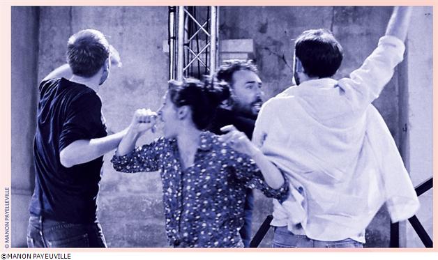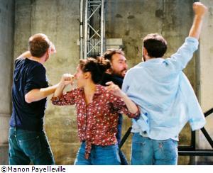 Quatre comédiens portent ce récit réglé au millimètre par la mise en scène de Julie Guichard. Les rôles s’échangent, les personnages volent de corps en corps, de mots en mots. Avec leur seule parole et la fabuleuse énergie physique qu’ils déploient, ils donnent corps à une manifestation, un avion, un commissariat, un hôpital, une prison…
