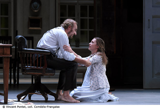 Vingt-quatre ans que Père de Strindberg n’a pas été donné à la Comédie-Française, depuis son entrée au répertoire signée de Patrice Kerbrat dont se souvient le réalisateur Arnaud Desplechin. S’il crée ici sa première mise en scène au théâtre, Père est une œuvre qui l’accompagne depuis longtemps. Très marqué par l’interprétation du Capitaine par Jean-­Luc Boutté en 1991, cette pièce fait partie de ces pépites théâtrales dont il s’alimente avant d’aborder l’écriture d’un film.