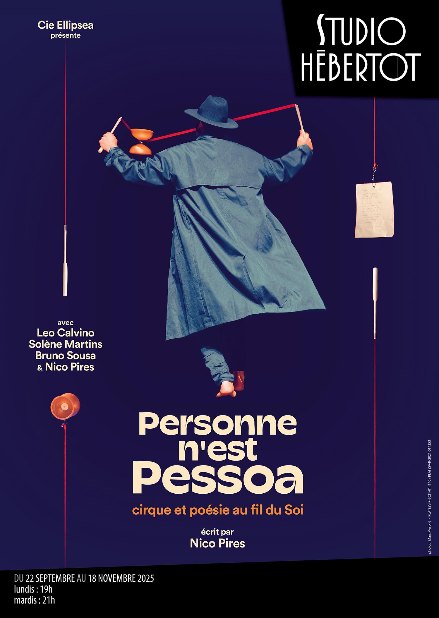 Entre cirque et poésie, musique live et récit de vie, les 4 artistes de la Cie Ellipsea rendent ici hommage à l'énigmatique poète portugais Fernando Pessoa, créant des ponts avec leurs propres chemins et leurs racines. Les figures de style, rimées ou jonglées, se cherchent, se perdent, s’entrechoquent, pour parfois réussir à articuler quelques rêves, quelques doutes et une farandole d’émotions.