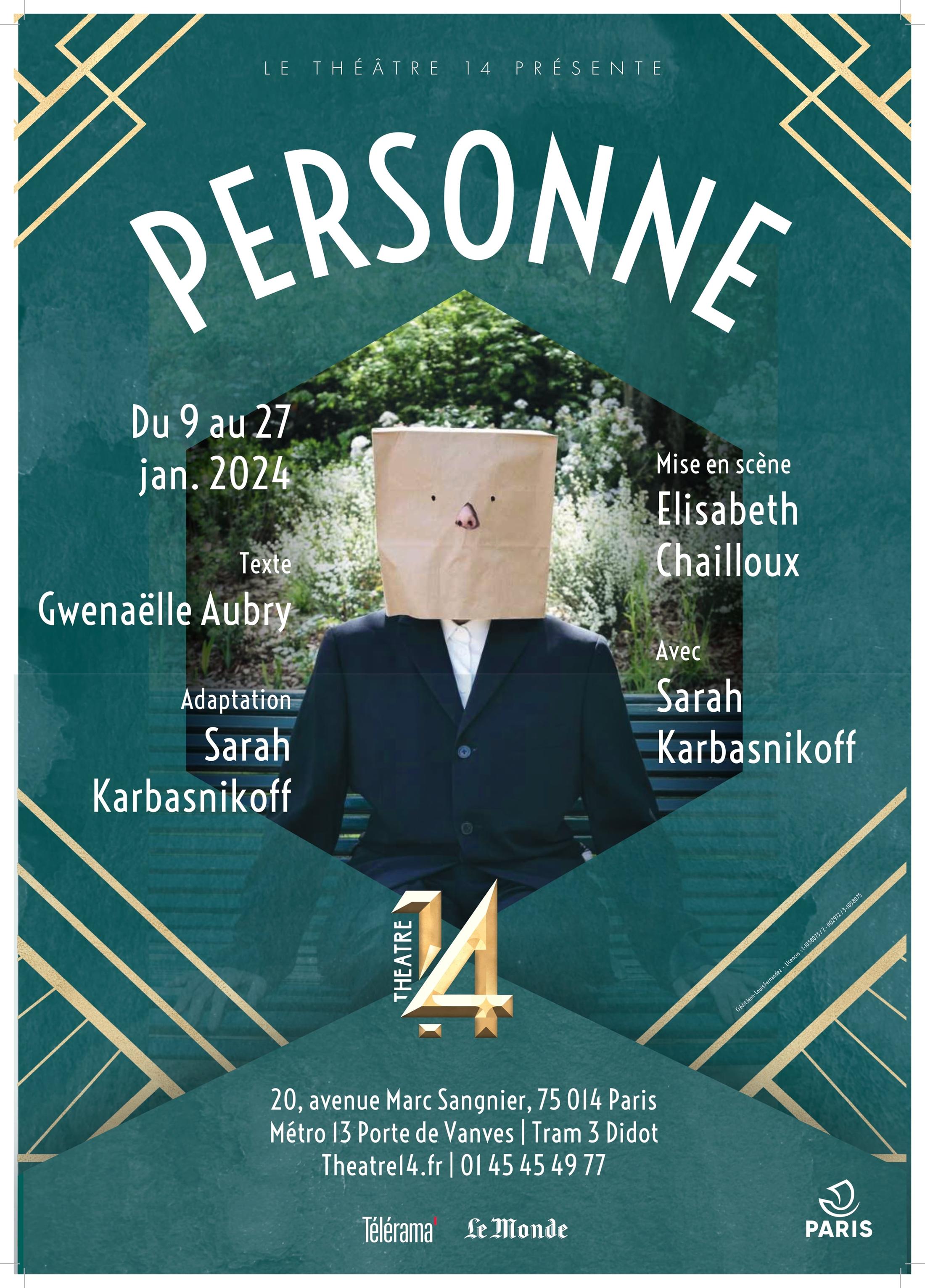 Personne est un "tombeau", terme employé en musique pour un hommage funèbre et laudatif (le tombeau de Couperin) . ici de la fille à son père . Il est assez rare dans la littérature de "tomber" sur un texte dont la lecture vous imprègne à jamais, comme celui de de Gwenaelle Aubry. Récit à la fois émouvant, profondément sincère, d'une suprême lucidité, car l'autrice tout en s'immergeant dans le passé douloureux de son père, tient à distance tout pathos - une grande pudeur, pour nous "livrer" à travers son abécédaire une œuvre dont elle dit qu'elle lui a permis de changer son deuil en vie, de suturer la faille, l'absence en mémoire, le naufrage en trésor sous un linceul de mots. Magnifique exemple d'une quête personnelle dans l'abnégation et la rédemption - la langue est à la fois intense, charnelle, poignante et in fine salvatrice. Il faut un talent rare pour jouer ce registre, toutes ses nuances subtiles. Sarah Karbasnikof réussit haut la main (haut la voix) de donner à ce diamant noir et blanc une chair théâtrale, que la salle reçoit religieusement. Merci au théâtre 14 de toujours nous offrir ces moments précieux de bonheur théâtre, par la qualité jamais démentie des textes choisis. En un mot, l'autrice, l'actrice, le metteur en scène (Elisabeth Chailloux) avec la complicité des dirigeants du théâtre 14 "honorent l'intelligence" du spectateur pour reprendre une formule chère à Ingmar Bergman.