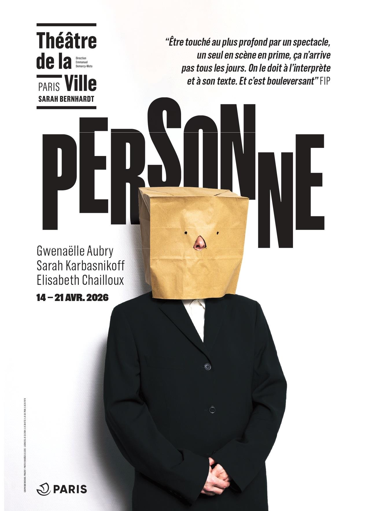 Personne est un "tombeau", terme employé en musique pour un hommage funèbre et laudatif (le tombeau de Couperin) . ici de la fille à son père . Il est assez rare dans la littérature de "tomber" sur un texte dont la lecture vous imprègne à jamais, comme celui de de Gwenaelle Aubry. Récit à la fois émouvant, profondément sincère, d'une suprême lucidité, car l'autrice tout en s'immergeant dans le passé douloureux de son père, tient à distance tout pathos - une grande pudeur, pour nous "livrer" à travers son abécédaire une œuvre dont elle dit qu'elle lui a permis de changer son deuil en vie, de suturer la faille, l'absence en mémoire, le naufrage en trésor sous un linceul de mots. Magnifique exemple d'une quête personnelle dans l'abnégation et la rédemption - la langue est à la fois intense, charnelle, poignante et in fine salvatrice. Il faut un talent rare pour jouer ce registre, toutes ses nuances subtiles. Sarah Karbasnikof réussit haut la main (haut la voix) de donner à ce diamant noir et blanc une chair théâtrale, que la salle reçoit religieusement. Merci au théâtre 14 de toujours nous offrir ces moments précieux de bonheur théâtre, par la qualité jamais démentie des textes choisis. En un mot, l'autrice, l'actrice, le metteur en scène (Elisabeth Chailloux) avec la complicité des dirigeants du théâtre 14 "honorent l'intelligence" du spectateur pour reprendre une formule chère à Ingmar Bergman.