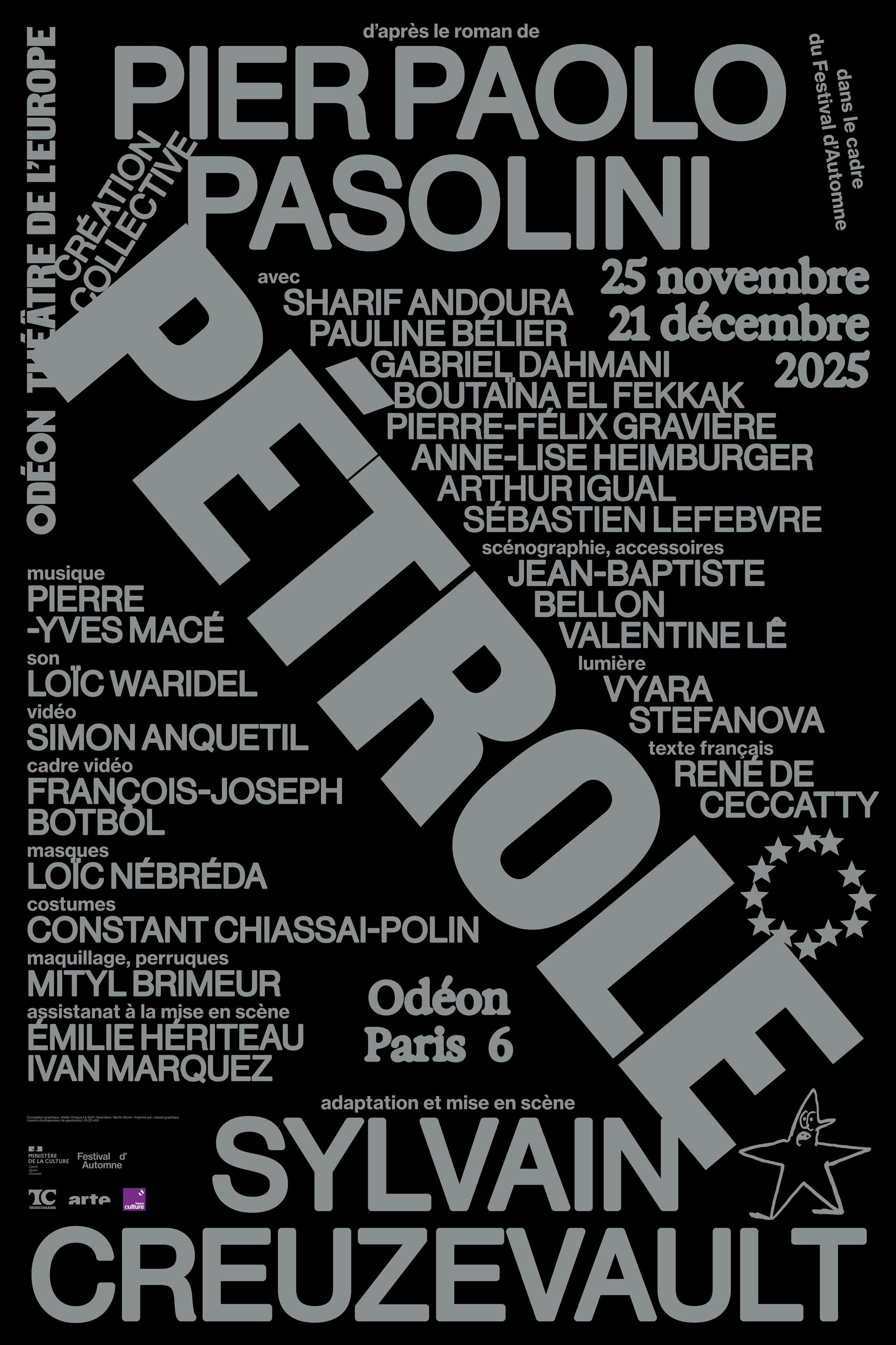 En donnant corps à Pétrole, Sylvain Creuzevault fait dialoguer une littérature poussée à ses limites avec un théâtre qui, tout comme le roman, se déploie en un assemblage inachevable. Il nous convie — et nous guide — dans une plongée vertigineuse au cœur des visions pasoliniennes de l’enfer et du paradis italien des années 1960-1970. Au cœur des terrains vagues de Rome, le metteur en scène poursuit l’édification de son « cabajoutis » — métaphore revendiquée de son théâtre : ces bâtisses faites d’éléments dissemblables, où la trace des outils reste visible.