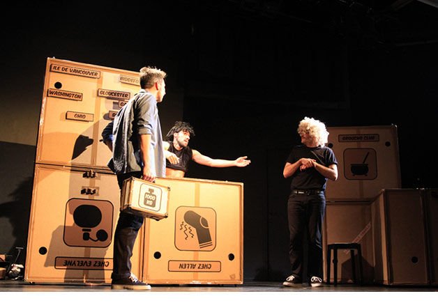 « En scène, évoluant au coeur d’une scénographie constituée de cartons de déménagement dont les étiquettes indiquent les nombreux lieux de l’action, multipliant les rôles à la vitesse de l’éclair, composant des personnages impayables, hauts en couleurs, approximativement lookés, perruqués, lunettés, recourant à la vidéo, réalisant des effets spéciaux merveilleusement cheap et inventifs, se chamaillant régulièrement, ces cinq acteurs pleins de malice s’en donnent à coeur joie ! » Fous de théâtre