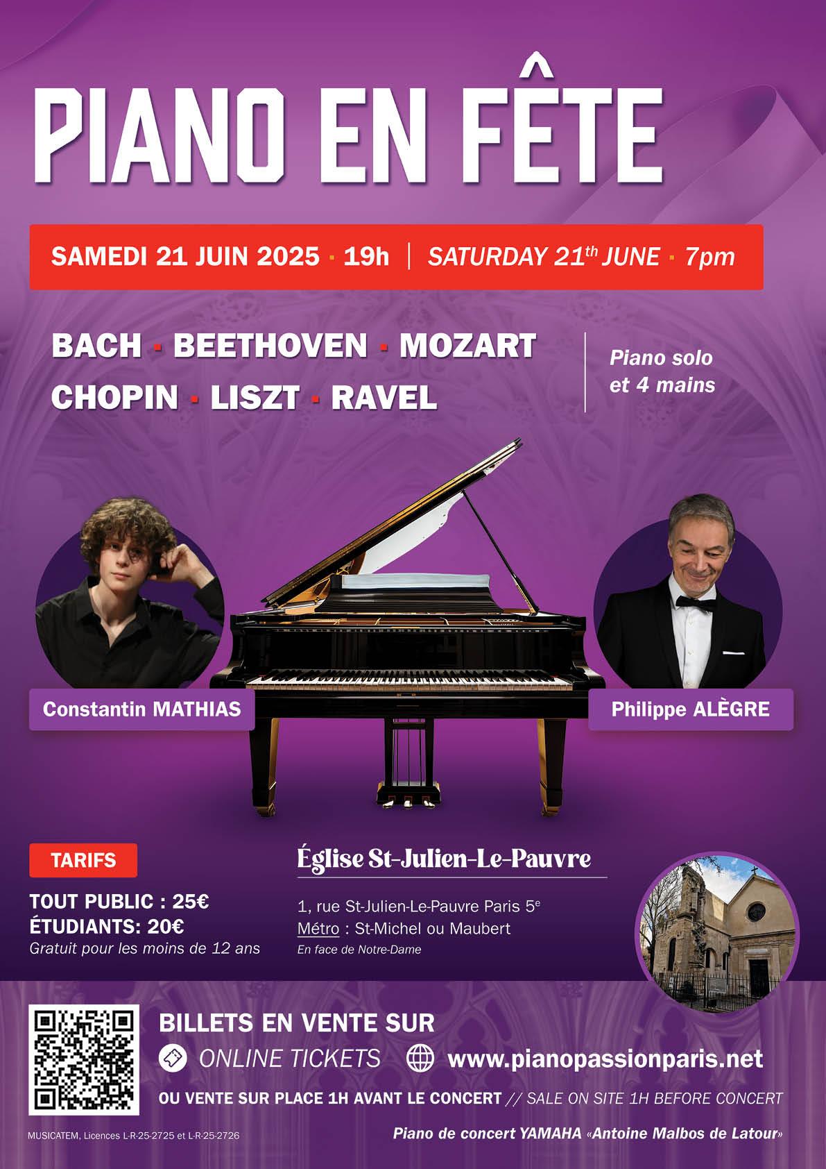 Pour fêter la musique, Philippe Alègre et Constantin Mathias propose une soirée pétillante autour des plus belles pages pour piano tant en solo qu'à quatre mains.
