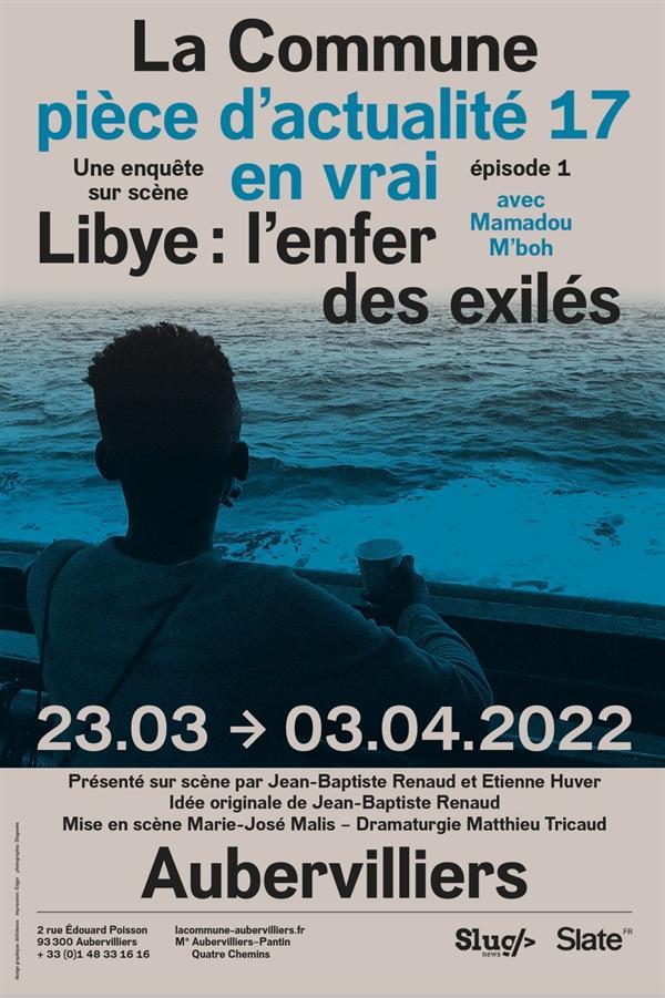 Une enquête sur scène. Épisode 1, Libye : l’enfer des exilés. Pour ce premier opus, Marie-José Malis s’est entourée de deux journalistes d’investigation, Étienne Huver et Jean-Baptiste Renaud, dont le documentaire sur la traversée et le sauvetage des migrants en Méditerranée a marqué un véritable tournant dans leurs existences.