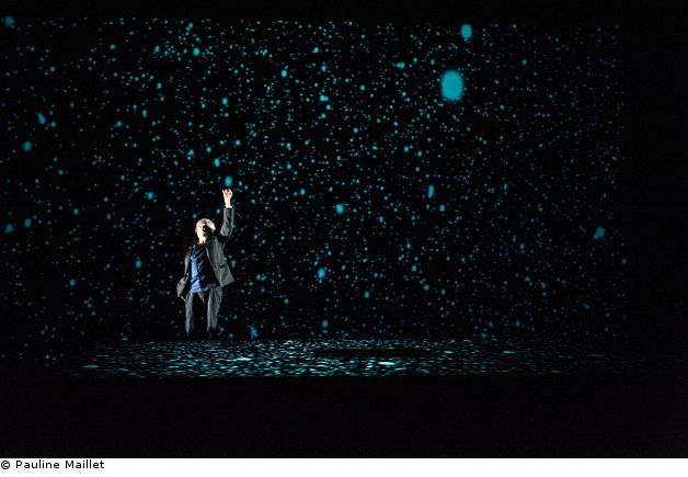 À partir de ce dictionnaire amoureux, il construit un chemin de mots, un écrin à l’acteur Pierre Richard. Il dévoile une autre face de ce Pierrot lunaire, par une échappée imaginaire où scintille la lumière, sculptée par les créateurs Éric Soyer et Renaud Rubiano. C’est un monde fantastique qui s’ouvre, peuplé de démons et de merveilles ; un voyage à l’orée de la nuit. La présence vivante du comédien funambule s’inscrit au cœur du film réalisé par Pierre-Henri Gibert pour le spectacle. Y surgit la grâce féminine d’une danseuse, corps céleste, émouvant et mouvant, Marie-Agnès Gillot, étoile de l’Opéra de Paris, sur des musiques inédites de Laurent Petitgand, compositeur de Wim Wenders (Les ailes du désir, Le sel de la terre).