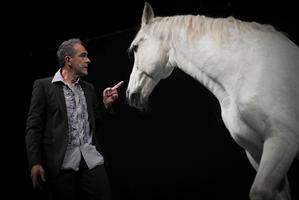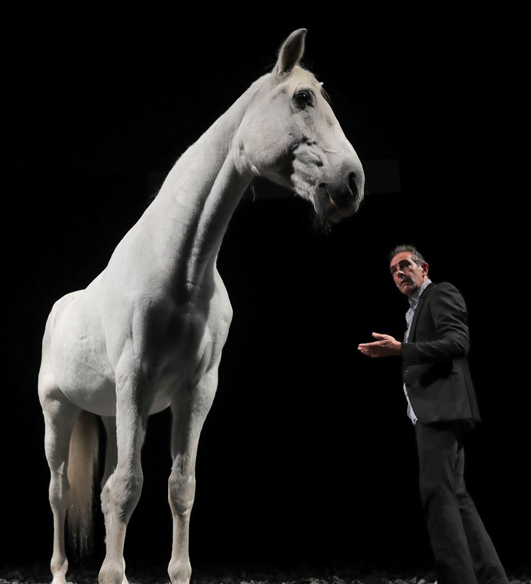 C’est un dialogue entre deux acteurs. Ils ont le même âge, mais l’un d’eux pèse six cents kilos et vieillit trois fois plus vite que son partenaire. Depuis leur rencontre au sein du Théâtre du Centaure, Bertrand Bossard et Akira sont inséparables. On parlerait presque de rapport amoureux. En mettant en scène l’amitié entre un humain et un cheval, avec leurs petites chamailleries mais surtout une grande complicité, ce spectacle offre un exemple charmant et drôle d’une relation constructive avec le vivant. Car Akira n’est pas seulement un performeur hors pair, toujours prêt si le coeur lui en dit à pousser la chansonnette, il exprime aussi son opinion plutôt critique sur les dégâts infligés par l’homme à la planète.