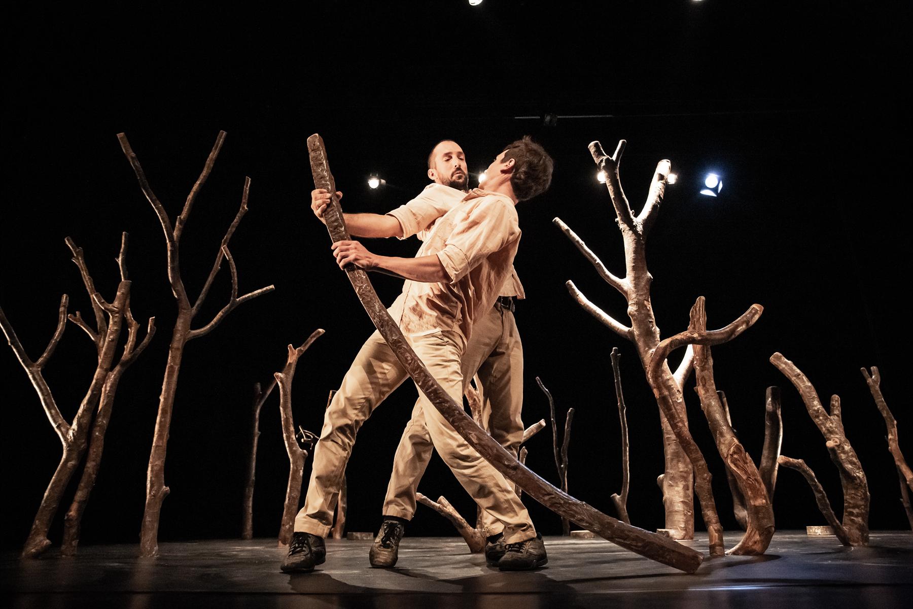 Le duo de danseurs et acrobates Fnico Feldmann et Itamar Glucksmann inscrit son pas de deux dans un décor de bois : des troncs d’arbres. Une véritable forêt de hêtres naît sous nos yeux ! Tout au long de la pièce, les artistes explorent les relations possibles avec le bois, matière en permanente transformation, et construisent avec lui des équilibres virtuoses, des figures inattendues. Dynamiques ou statiques, ils multiplient les prouesses techniques et déroulent une chorégraphie fluide, pleine d’acrobaties ludiques. Ils explorent les potentialités d’un agrès qu’ils inventent tout en respectant sa nature profonde. Le bois brut se forme et se déforme, se tord et se balance. Comme eux ! Les circassiens font corps avec la matière et composent des tableaux magiques d’une poésie rarer.