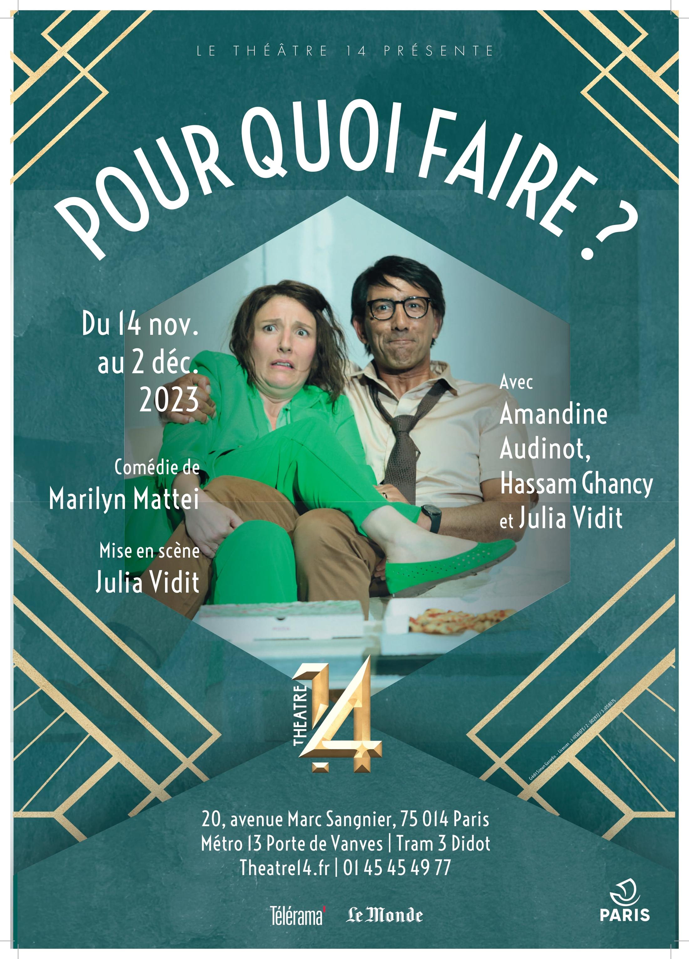 Pour quoi faire ? est une commande d’écriture passée à Marilyn Mattei pour expérimenter théâtralement notre rapport au temps et à la vitesse. Julia Vidit, metteuse en scène et actrice, déploie au plateau, avec ses deux partenaires complices, la théâtralité de cette comédie aux allures de dystopie contemporaine. L’espace faussement réaliste offre la vue en coupe d’un salon de pavillon au canapé déglingué, dans lequel les personnages se battent irrémédiablement contre le temps, s’arrêtant parfois comme pour nous demander : et vous ?