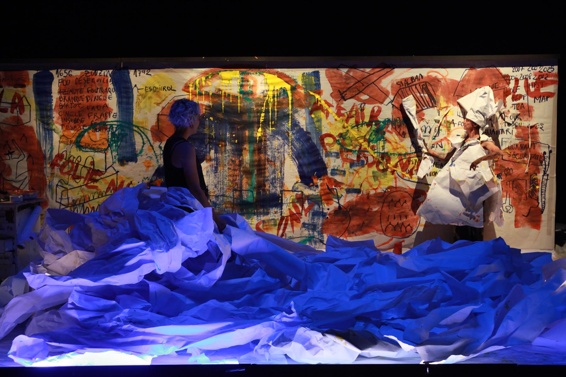 L’expression latine pro bono publico signifie « pour le bien public ». Ce « bien public », Dominique Habouzit est allé l’observer dans différents services de soins psychiatriques. Au fil de ses recherches, la compagnie a trouvé un motif d’espérer : à certains endroits s’inventent des façons plus humanistes de soigner. Sur le plateau, la comédienne et marionnettiste Sarah Darnault, accompagnée du plasticien et circassien Fer Flores, racontent cette immersion parmi les patients et le personnel soignant. On y entend des mots du metteur en scène Dominique Habouzit, écrits dans son carnet de bord qu’il tenait à l’hôpital pendant sa résidence. On y trouve aussi de grands rouleaux de papier transformés de mille manières par les interprètes qui les froissent, les suspendent, les découpent.