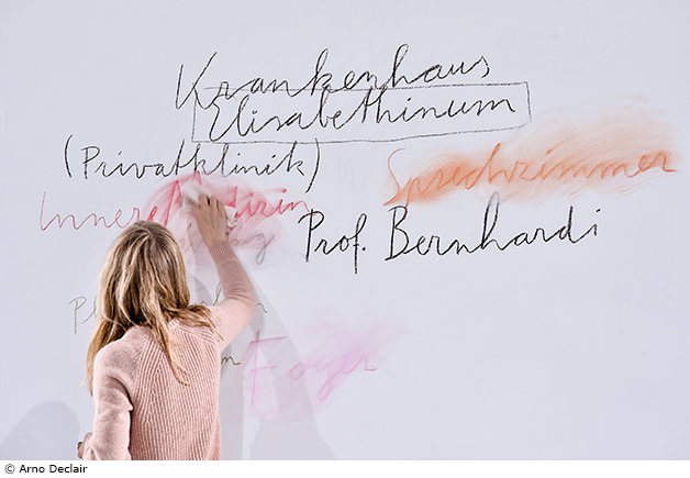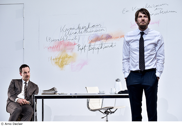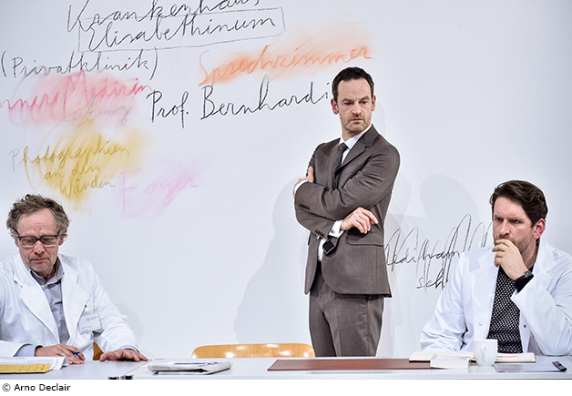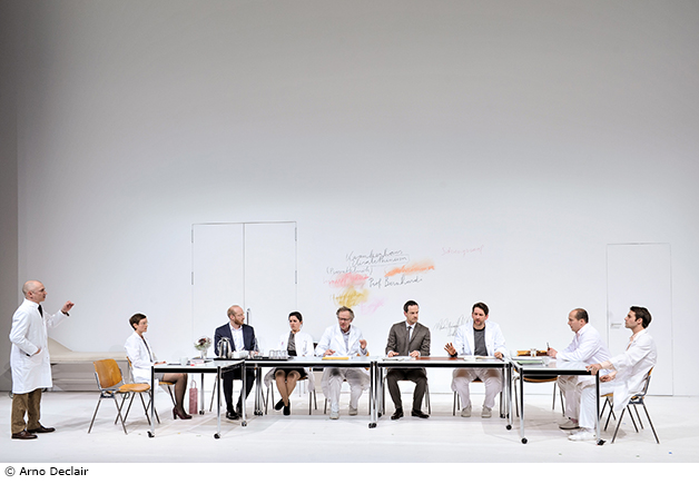 Professeur Bernhardi est l’un des rares textes dramatiques explorant minutieusement un contexte professionnel au-delà du cadre émotionnel et familial de ses personnages. Le monde professionnel de l’hôpital y est traité en modèle réduit d’une société dominée par le carriérisme, la concurrence et le ressentiment, à l’antisémitisme latent. Dans sa mise en scène de cette comédie de Schnitzler – c’est avec cette ambiguïté que l’auteur qualifiait sa pièce – Thomas Ostermeier s’attache particulièrement à la question de savoir comment un cas isolé peut devenir systématiquement instrumentalisé par un groupe afin de satisfaire ses propres intérêts et désirs de pouvoir ; comment des faits apparemment indiscutables peuvent être déformés et relativisés au point que « l’objectivement vrai » perde peu à peu ses contours. Que reste-t-il de la vérité lorsqu’elle se retrouve pulvérisée en interprétations divergentes ?