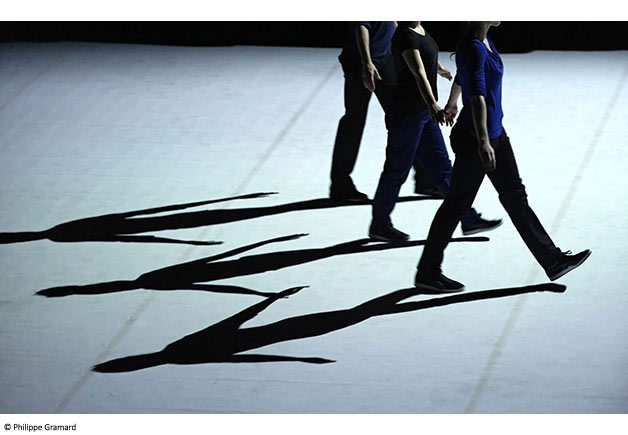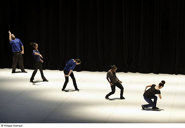 Au sortir d’un récent duo (Yonder Woman, 2010) où elle détourne les conventions de la performance « au sol » pour y introduire le contact, Anne Nguyen s’attaque donc à sa Promenade obligatoire. Une heure de cheminement ininterrompu pour huit danseurs debout. Virtuoses des battles de Popping, ils sont amenés à traverser et retraverser le plateau dans un seul et même sens, comme condamnés à une boucle perpétuelle sur des corridors de lumière non négociables.