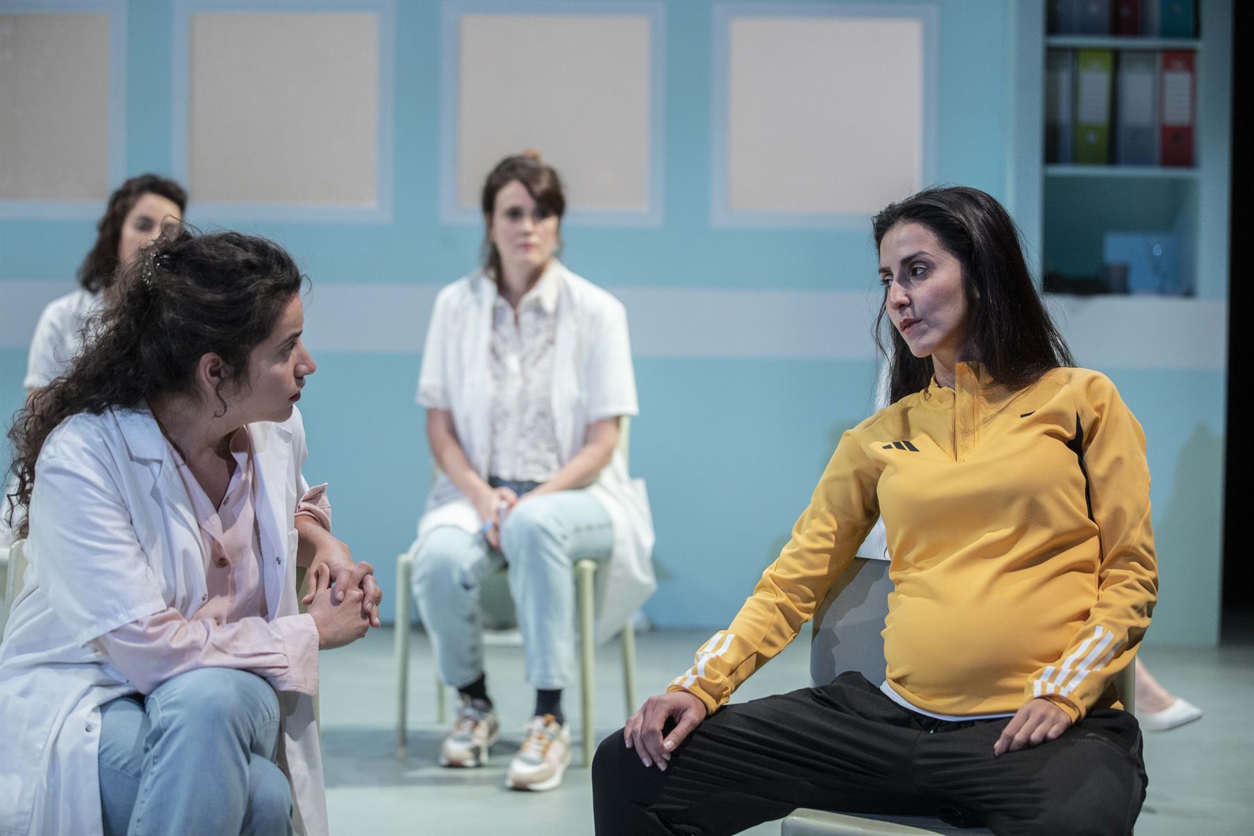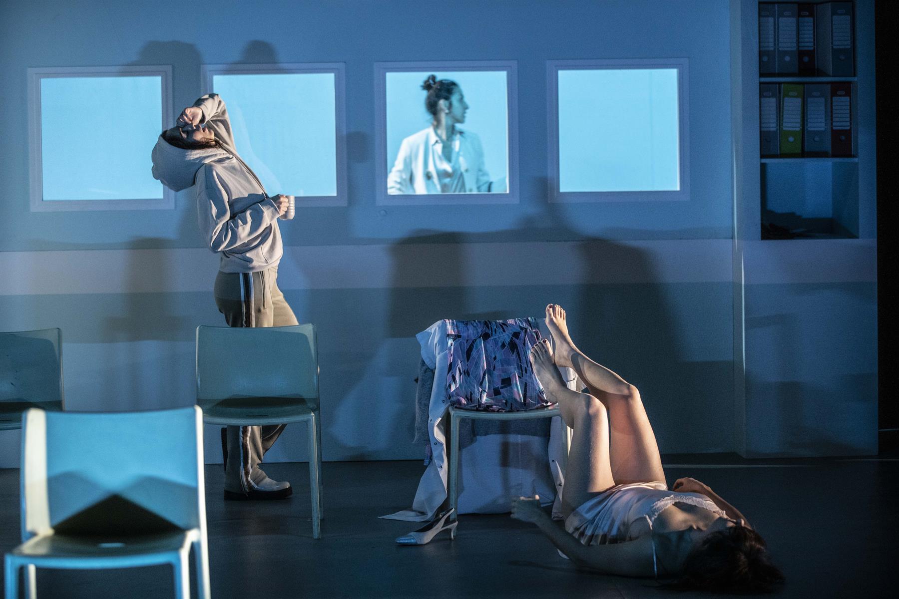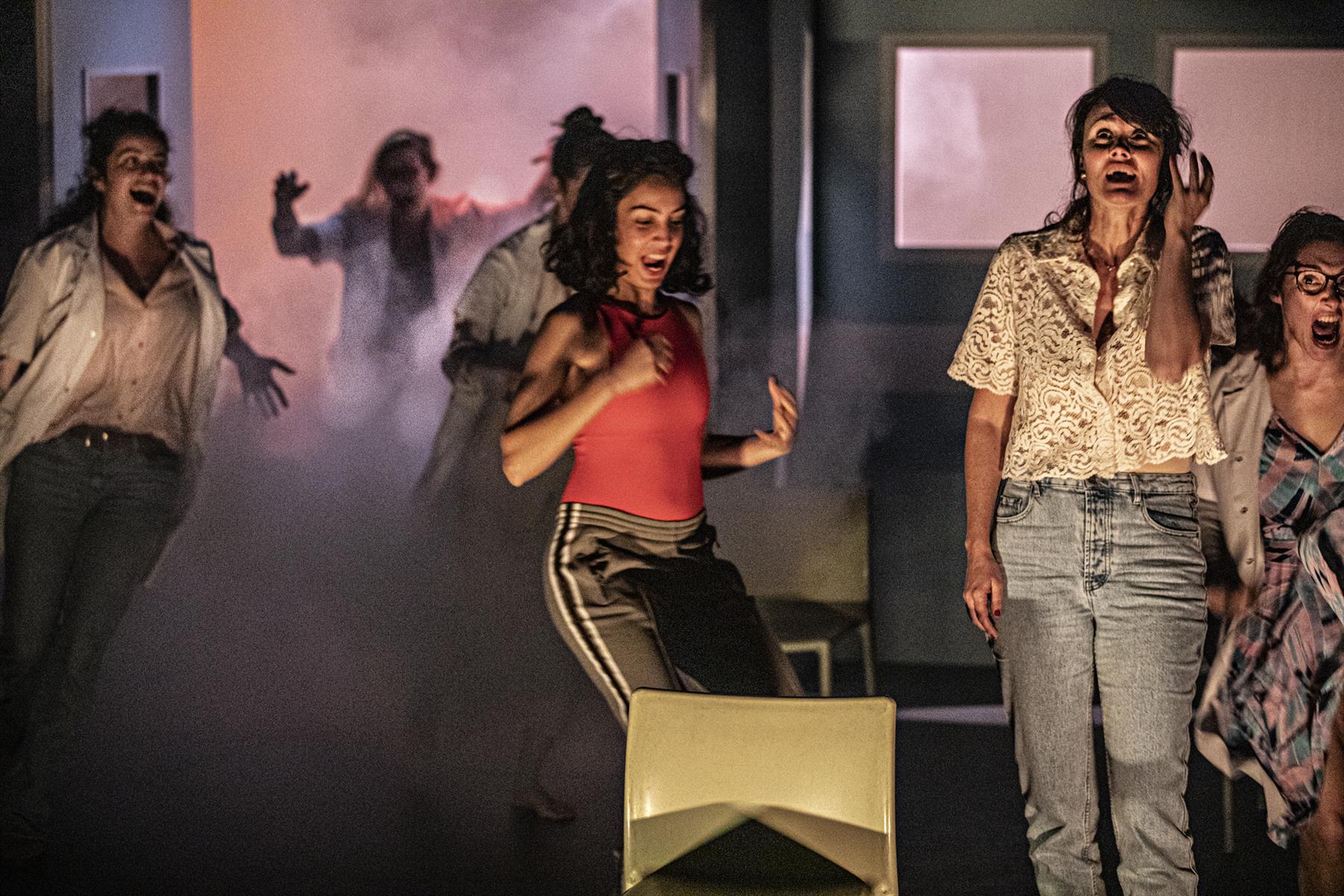 Dans Psychodrame, nous sommes dans une salle un peu défraîchie, une salle « d’activité » ou de réunion comme il y en a dans tous les équipements publics. Sept chaises au plateau cette fois. Six comédiennes et dix personnages. Six soignantes et quatre patientes. Des femmes blessées qui ne savent pas maîtriser leur violence, ne savent plus vivre dans le monde, se sentent rejetées ou ont des traumatismes trop lourds à dire. Les comédiennes se métamorphosent, passent d’un rôle à l’autre, d’un personnage de soignante à un personnage de patiente, comme pour nous rappeler que les frontières sont poreuses, que nous pouvons facilement passer d’une chaise à une autre : apporter de l’aide, puis en avoir besoin. Le monde aussi a un peu changé en cinq ans. Disons que nous sentons plus concrètement encore qu’autour de nous les murs s’effritent et qu’il nous faut tenir bon ensemble ou rien. Dans cette histoire que nous inventons ensemble surgissent des échos à nos inquiétudes politiques actuelles. La destruction des services publics, la maltraitance alarmante des patient.e.s et la souffrance au travail de ceux et celles qui les soignent, nos peurs plus diffuses d’effondrement, la question des générations futures… Ces femmes ne veulent pas lâcher, David contre Goliath, elles se battent pour une forme d’utopie. Le décor progressivement se transforme dans une forme de destruction ou de renaissance. Dans la pièce, nous parlons aussi de ces combats collectifs qui nous tiennent et qui nous dévorent à la fois.