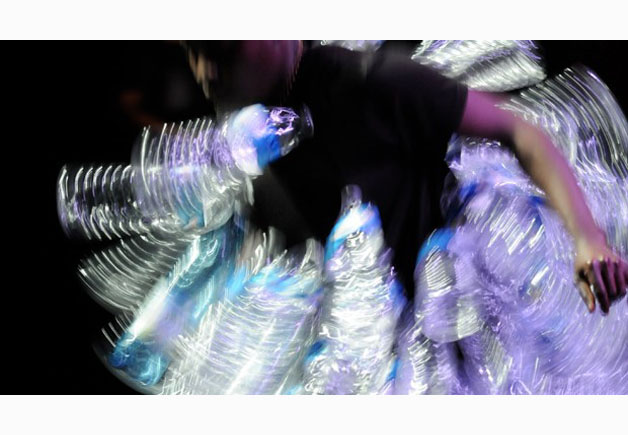 Elle quitte la scène, ose d’autres lieux de la salle. Gestes insolents, insoumis, provocants, elle se révolte, apostrophe les politiques, s’exhibe et s’insurge. Plus loin, elle se heurte aux déchets d’une civilisation déniée, prend un sac poubelle, l’ingurgite et le recrache, se fait un vêtement avec des bouteilles en plastique, parure de pacotille et récupération.