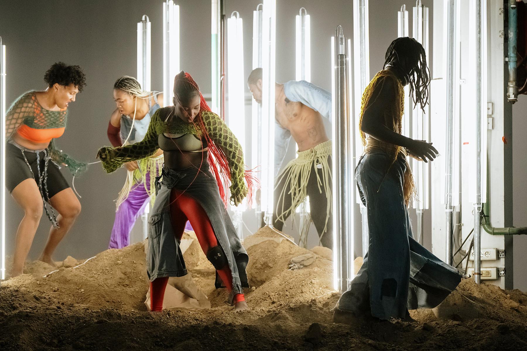 Sur un plateau dépouillé, seize interprètes se lancent dans une quête dansée de résilience, se laissant traverser par des djinns, des forces animales et des puissances invisibles. Dans cet univers, les temps se confondent et les symboles se superposent : les tressages artisanaux des costumes côtoient la réalité virtuelle et les nouvelles technologies, tandis qu’une bande sonore mêle archives, contes oraux et musique live. Ici, il ne s’agit pas de résoudre les crises, mais de composer avec le chaos comme un carnaval en enfer, un univers parallèle inondé de lumière.