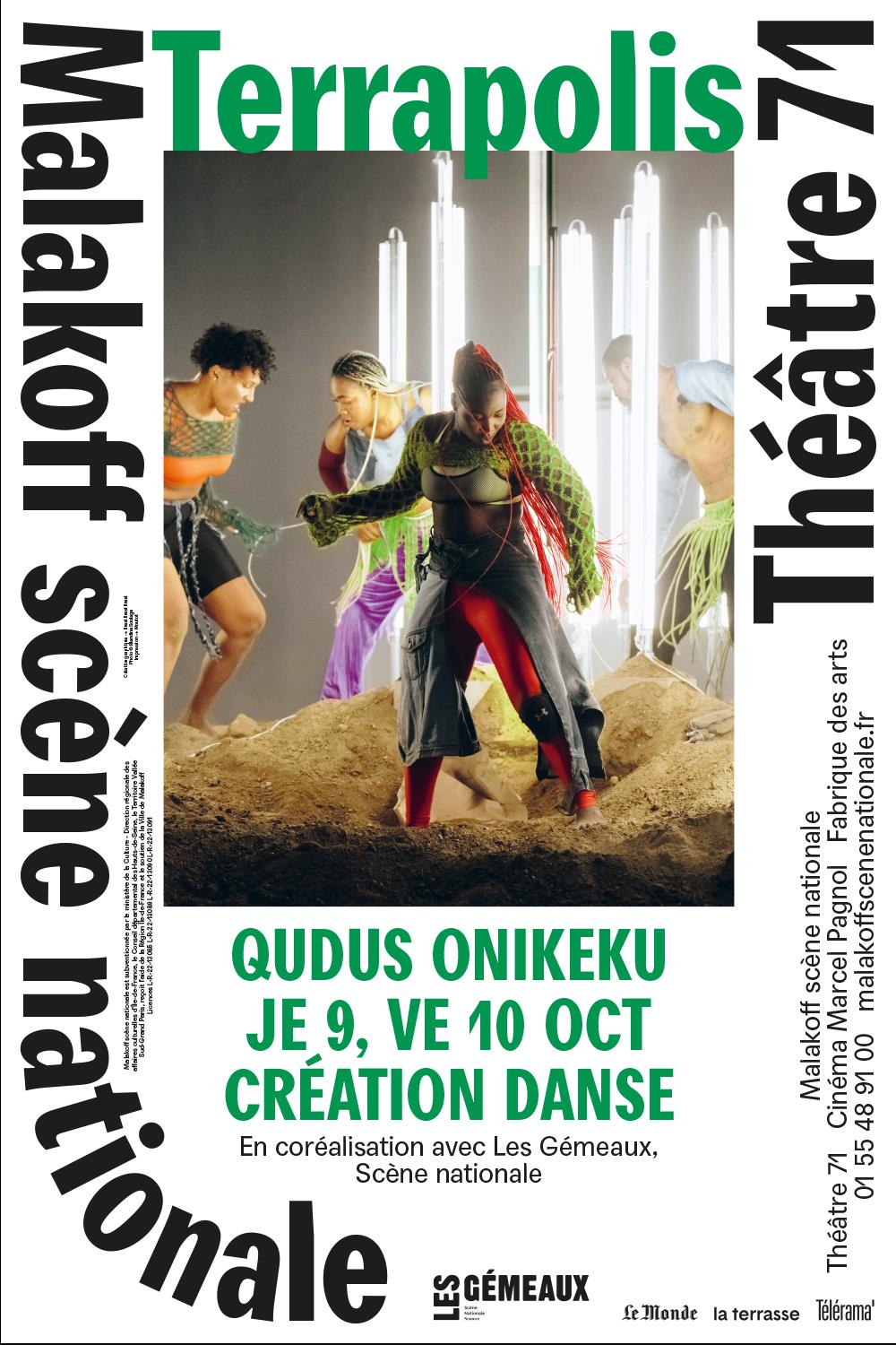 Le nigérian au parcours international Qudus Onikeku clôt sa trilogie afro-futuriste avec Terrapolis. Seize artistes pluridisciplinaires mêlent vitalité des danses urbaines, croyances spirituelles Yorùbá et nouvelles technologies. « Les temps difficiles exigent des danses endiablées ». Il s’agit alors de composer le chaos en une chorégraphie, comme un carnaval en enfer, un univers parallèle inondé de lumière, ou un conte dans lequel on retrouve la foi dans un monde sinon assombri.