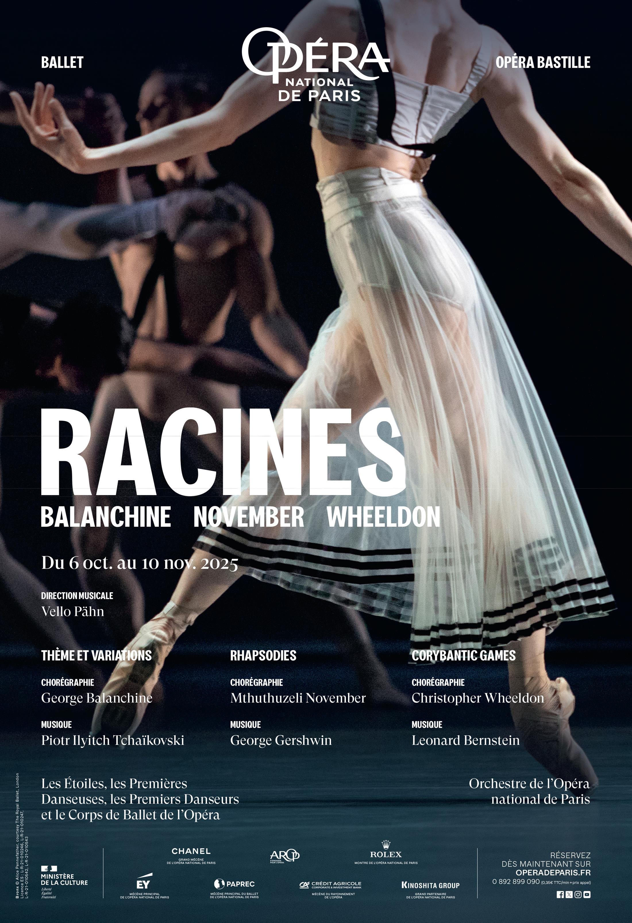 Intitulée Racines, cette soirée explore celles de George Balanchine qui rend hommage à la tradition académique russe qui l’a formé. Christopher Wheeldon puise quant à lui dans l’héritage de la Grèce antique. Entre ces deux pièces, Mthuthuzeli November fait son entrée au répertoire.