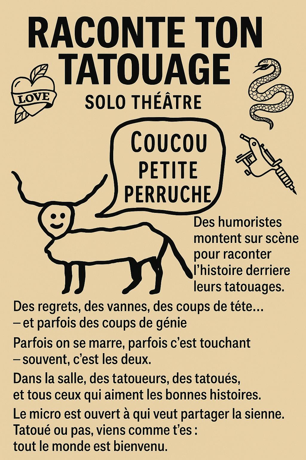 Des regrets, des vannes, des coups de tête… et parfois des coups de génie. Parfois on se marre, parfois c’est touchant, souvent, c’est les deux. Dans la salle, des tatoueurs, des tatoués, et tous ceux qui aiment les bonnes histoires. Le micro est ouvert à qui veut partager la sienne.