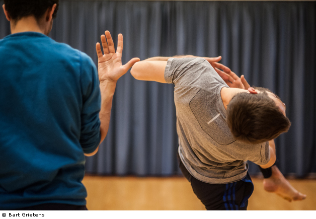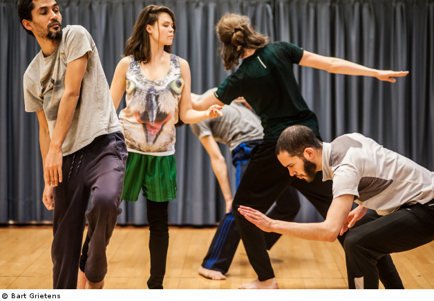 Sur le plateau, cela se traduit par un tapis orange sur lequel entrent et sortent les cinq danseurs habillés de noir – quatre hommes et une femme. Au son d'une musique planante, on peut croire qu'ils font des essais sous le regard des autres ou bien qu'ils s'exercent à des danses solitaires, chacun plongé dans son monde intérieur. Leur danse est délicate, légère, pleine d'élans et de tournoiements. Très vite, elle déborde du cadre : le tapis les met en lumière mais certains dansent dans l'ombre et il se dégage un tableau d'une étonnante douceur.