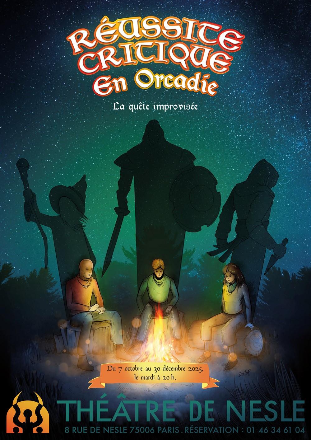 Réussite Critique en Orcadie est un spectacle unique, à la croisée du jeu de rôle et du théâtre d’improvisation. Guidés par un Maître du Jeu espiègle, les comédiens incarnent des héros en mission dans une contrée d’un monde fantastique riche, profond et original : l’Orcadie.