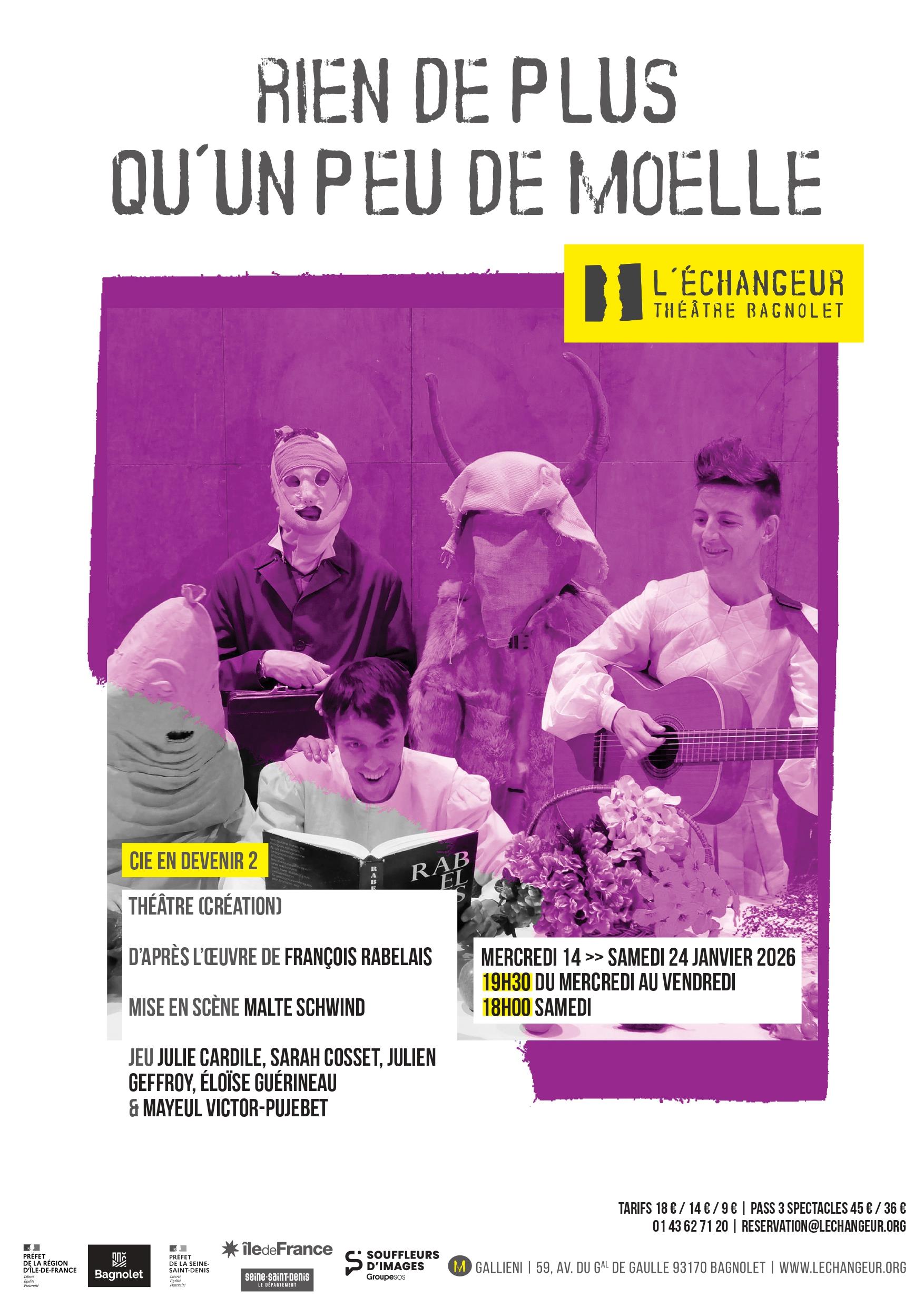 Rien plus qu’un peu de moelle est joué en moyen français, dans cette langue truculente, inouïe même à l’époque de Rabelais, dont Paul Valéry disait qu’elle était : « une langue étrangère qu’on se découvrirait savoir d’avance. »