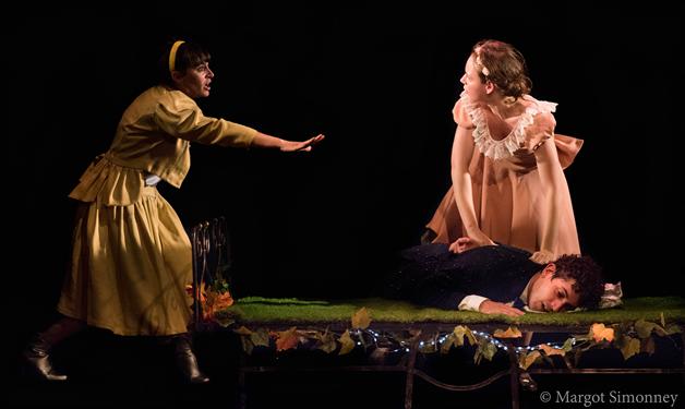 Avec eux, la fée Mimosa (qui est aussi la narratrice de l’histoire), apparaît comme une marraine fantasque et inexpérimentée, nous rappelant que les adultes ne sont pas toujours à la hauteur. Figure maternelle, elle accompagne les deux jeunes protagonistes dans cette aventure, mettant en lumière leurs états d’âmes adolescents.La scénographie, simple et esthétique, évoque sobrement l’époque romantique. Quelques éléments de décor viennent symboliser les différents espaces. Le reste se dessine grâce aux lumières, ombres chinoises et ambiances sonores, pour que la dimension féérique soit omniprésente tout au long du spectacle.